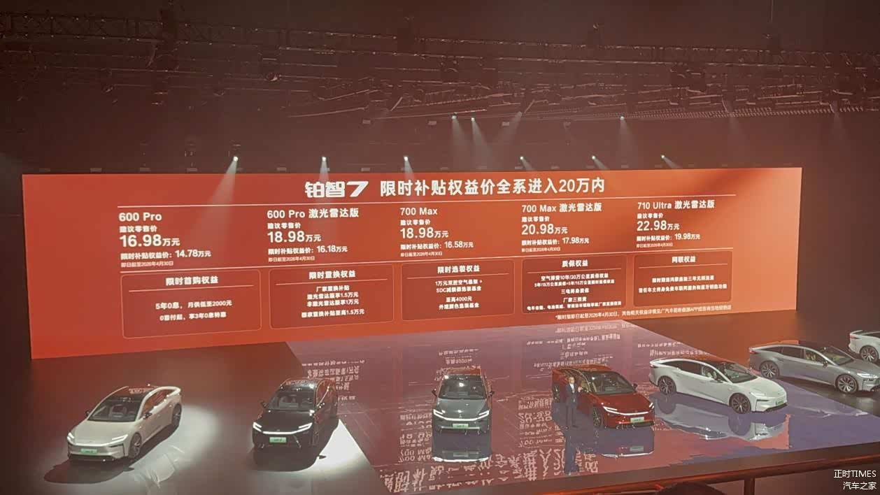 其中,铂智7 600Pro版限时补贴权益价14.78万元,作为入门版本,配置并未“缩水”,标配内置MoLA架构的鸿蒙座舱5,具备类人化智能交互功能,搭载带智能泊车的L2级智能辅助驾驶系统、华为智擎、尊界同款星闪钥匙、纯天然实木内饰、座椅通风加热、20寸轮毂等15余项实用配置。