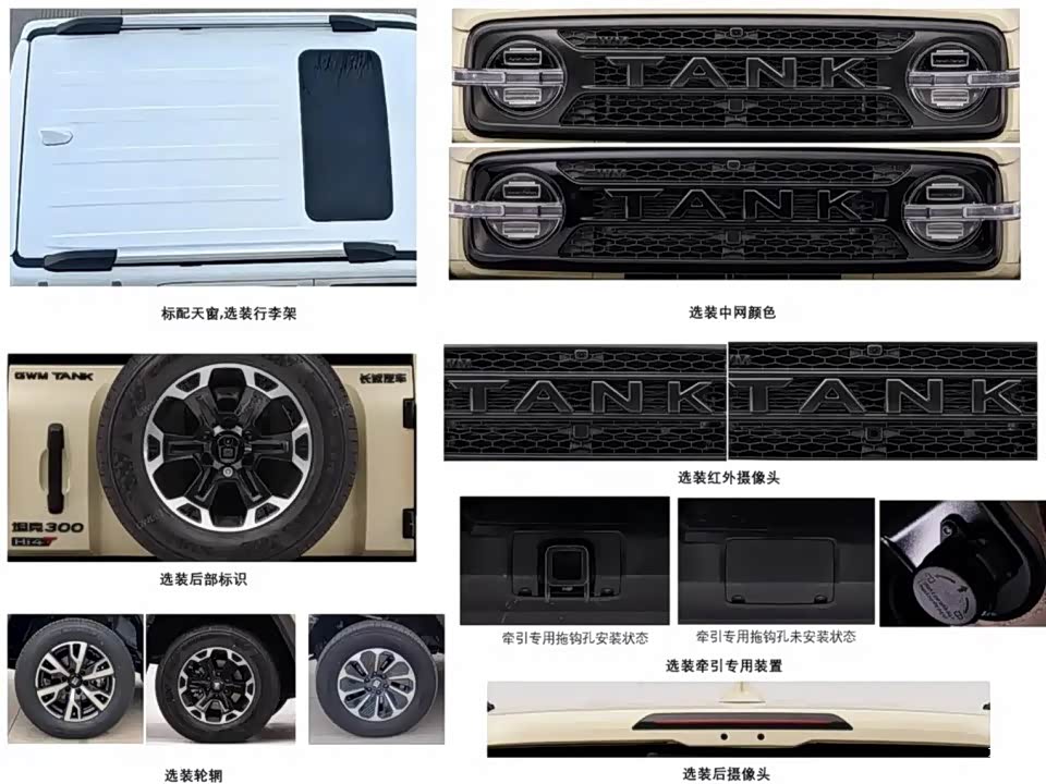 从外观上看,这款新车继续采用了经典的方形盒子硬派设计,并在细节上进行了优化和升级,使得整体的气场显得更为强大。车辆的前部设计维持了家族的标志性圆形大灯组,并对灯腔的细节进行了改进,再加上最新的“TANK”标志和高亮的格栅,整体给人一种非常硬朗的感觉;前部的设计更加具有越野的特点,可以选择安装前绞盘和通风盖板,以进一步增强户外的通行能力。