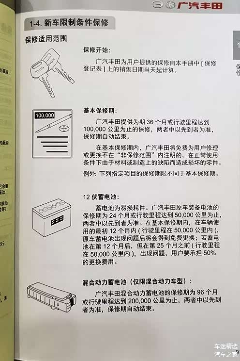 混合动力汽车和普通纯汽油汽车的区别在于拥有独立驱动车辆的电动机和单独的电池组模块,因此在官方手册上我们看到广汽丰田对此有单独的保修范围限制: