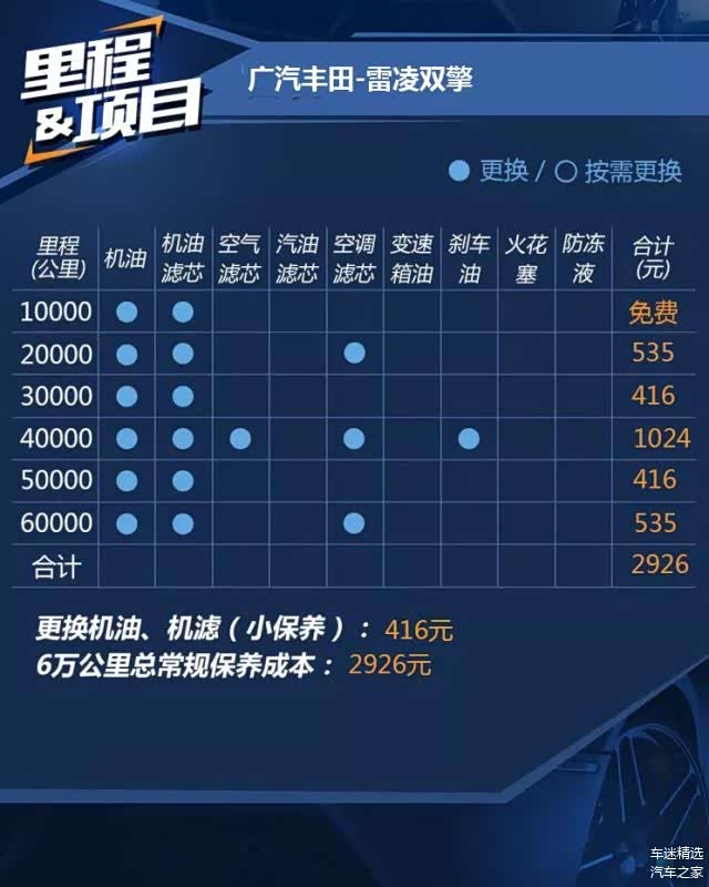 从用户手册上来看,三款不同动力总成的雷凌车型(雷凌1.2T、雷凌1.8L、雷凌双擎)保养周期统一均为1万公里。在用户实际保养中,可能会存在部分4S店以中国用车环境较差为由缩短保养间隔,但实际上对于一般的城市路况来说,使用全合成机油1万公里保养一次并无问题。