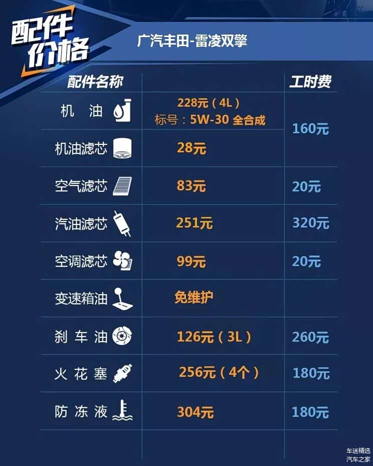如下表所示,雷凌双擎车辆保养的材料费和工时费均采集于北京地区广汽丰田汽车4S店,不同地区的价格可能略有差异,因此仅供参考。此外,雷凌双擎并不需要针对车辆电池和电机系统进行特殊的维护保养。整个保养项目与工时费与普通燃油版雷凌车型无异。