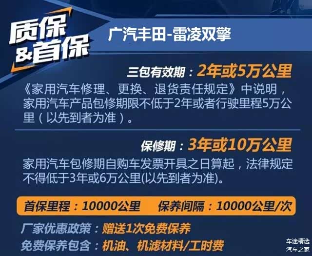 雷凌双擎的质保期和绝大部分的合资品牌质保期一样,三包有效期为2年或5万公里,基本保修期为36个月或10万公里,两者中以先到者为准。