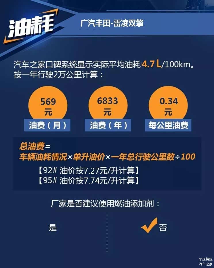 根据汽车之家用户真实口碑,该款车型综合油耗为4.7L/100km,根据北京地区京92号汽油7.27元/升,每年行驶2万公里来计算,雷凌双擎一年的总油费开支大约在6833元上下,折合每个月569元,每公里油费大约为0.34元。