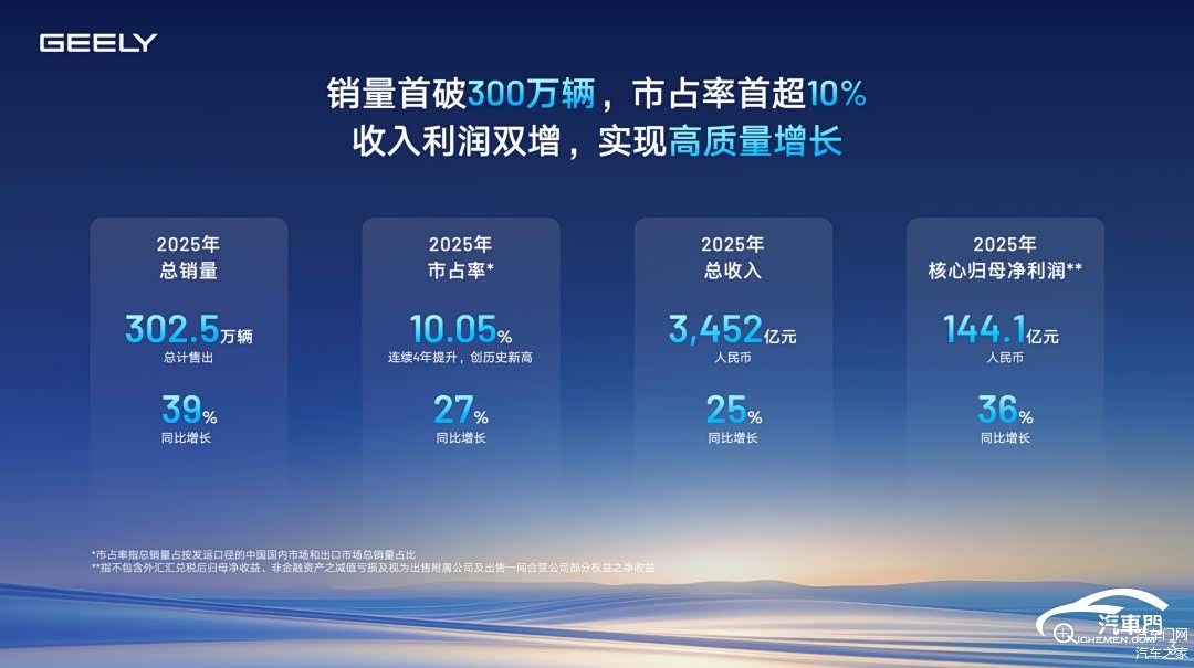 2025年的吉利,实现了“规模、利润、销量”的全面爆发,堪称年度最大黑马。过去一年,吉利实现营收3452亿元,同比增长了25%;扣非归母净利润达144.1亿元,同比大涨了36%;期末现金储备攀升至682亿元,同比增幅高达46%。