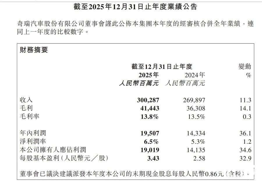 奇瑞上市后的首份财报,向市场展现了其强劲的增长韧性。2025年,奇瑞实现营收3002.9亿元,同比增长了11.3%,首次突破3000亿元大关;净利润达到了195.1亿元,同比增长了36.1%;净利润率从5.3%提升至6.5%,盈利质量大幅改善。