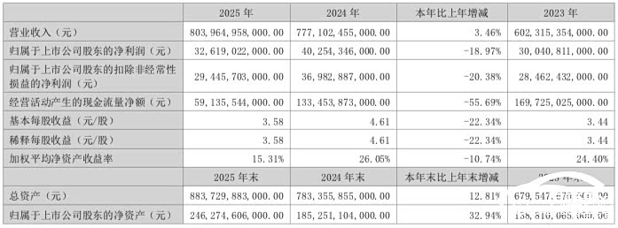 具体来看:2025年,比亚迪实现营收8039.65亿元,同比增长了3.46%,首度突破8000亿元大关。其中,汽车及相关产品业务收入达6486.46亿元,占总营收的80.68%。规模领跑的背后,比亚迪却陷入“增收不增利”的困境:其归属于上市公司股东的净利润为326.19亿元,同比下降了18.97%;扣非归母净利润同步下滑20.38%。