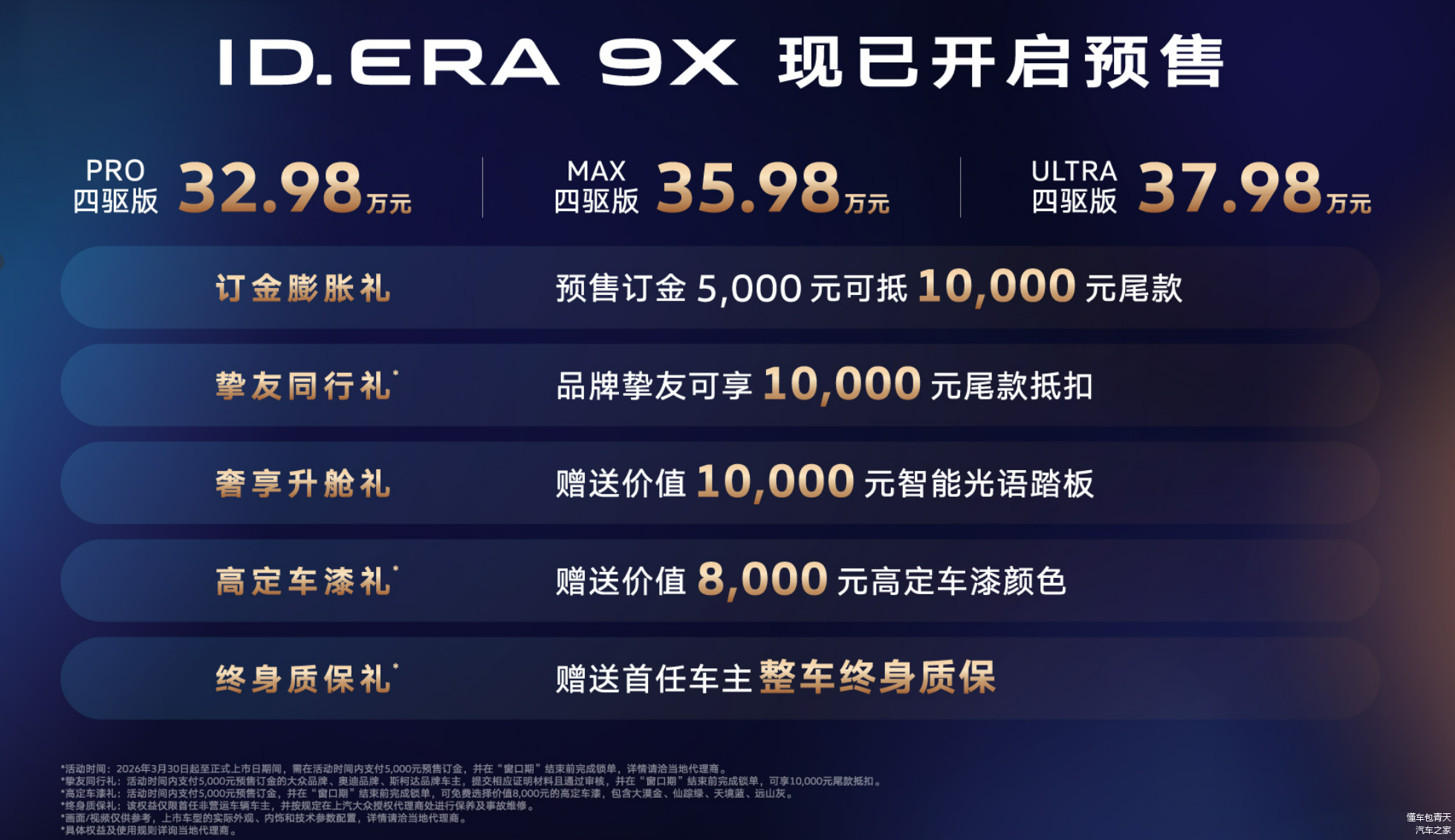 3月30日,上汽大众 ID.ERA 9X(图片 | 参数 | 询价)正式开启预售,32.98万元到37.98万元的价格区间,直接杀进了理想L9和问界M9的地盘。