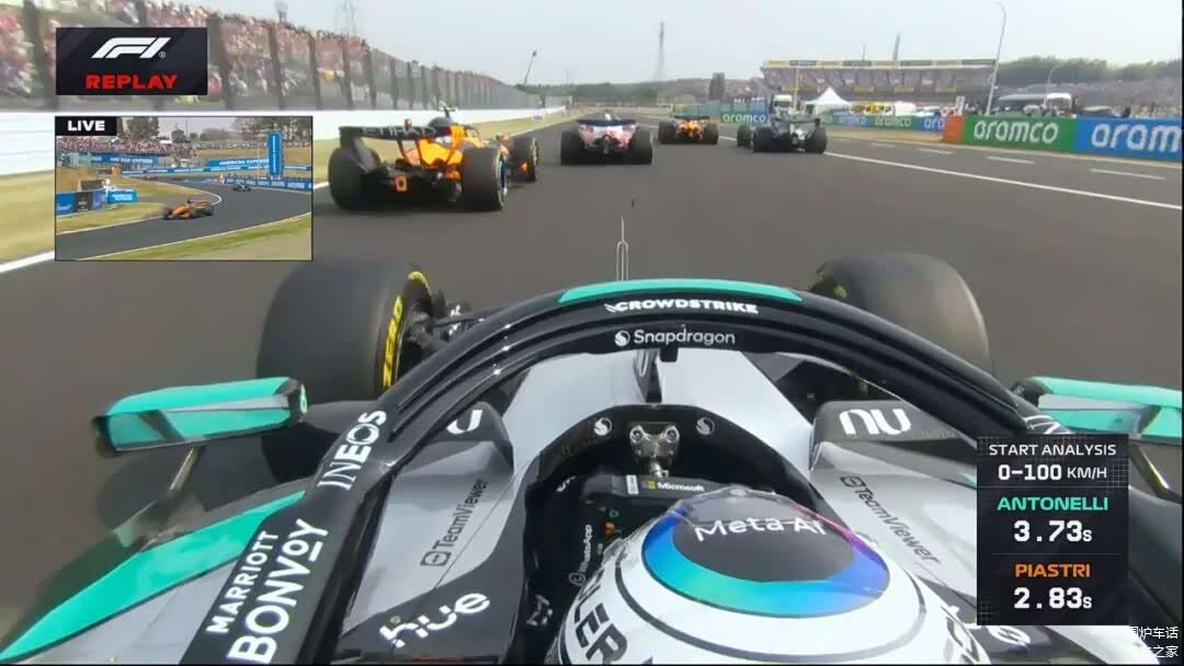 周日正赛开始,发车阶段梅奔两位车手起步都不理想,尤其是安东内利,慢镜回放后轮打滑了都冒烟了。一起步皮亚斯特里趁机从左侧超越来到了领跑位置,勒克莱尔则从两辆梅奔之间超了过来,来到第二。后方诺里斯和汉密尔顿也纷纷超越,拉塞尔掉到第四,安东内利落到第六。