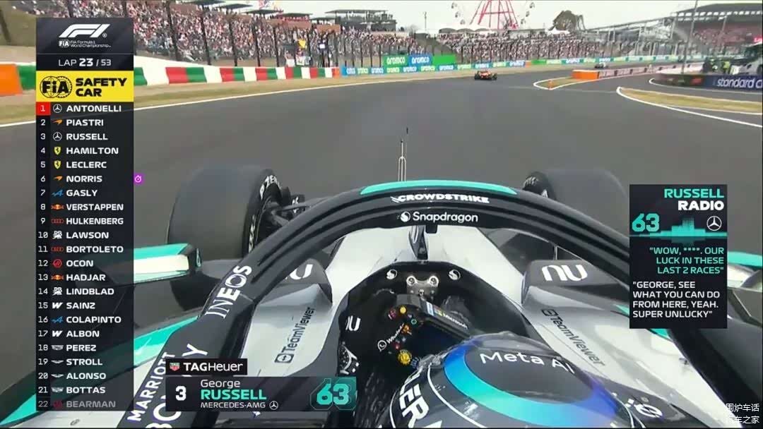 第19圈,皮亚斯特里进站一停,作为回应第21圈拉塞尔进站一停,出站后紧跟在皮亚斯特里之后,此时还没进站的安东内利,汉密尔顿和加斯利排在前三位。拉塞尔刚刚出站,后方贝尔曼在超越科拉平托的时候失控撞墙,安全车出动,拉塞尔大喊“unbelievable”,确实这周的运气太差。