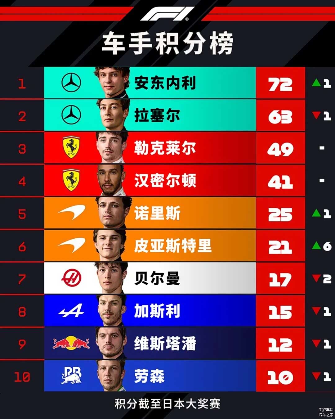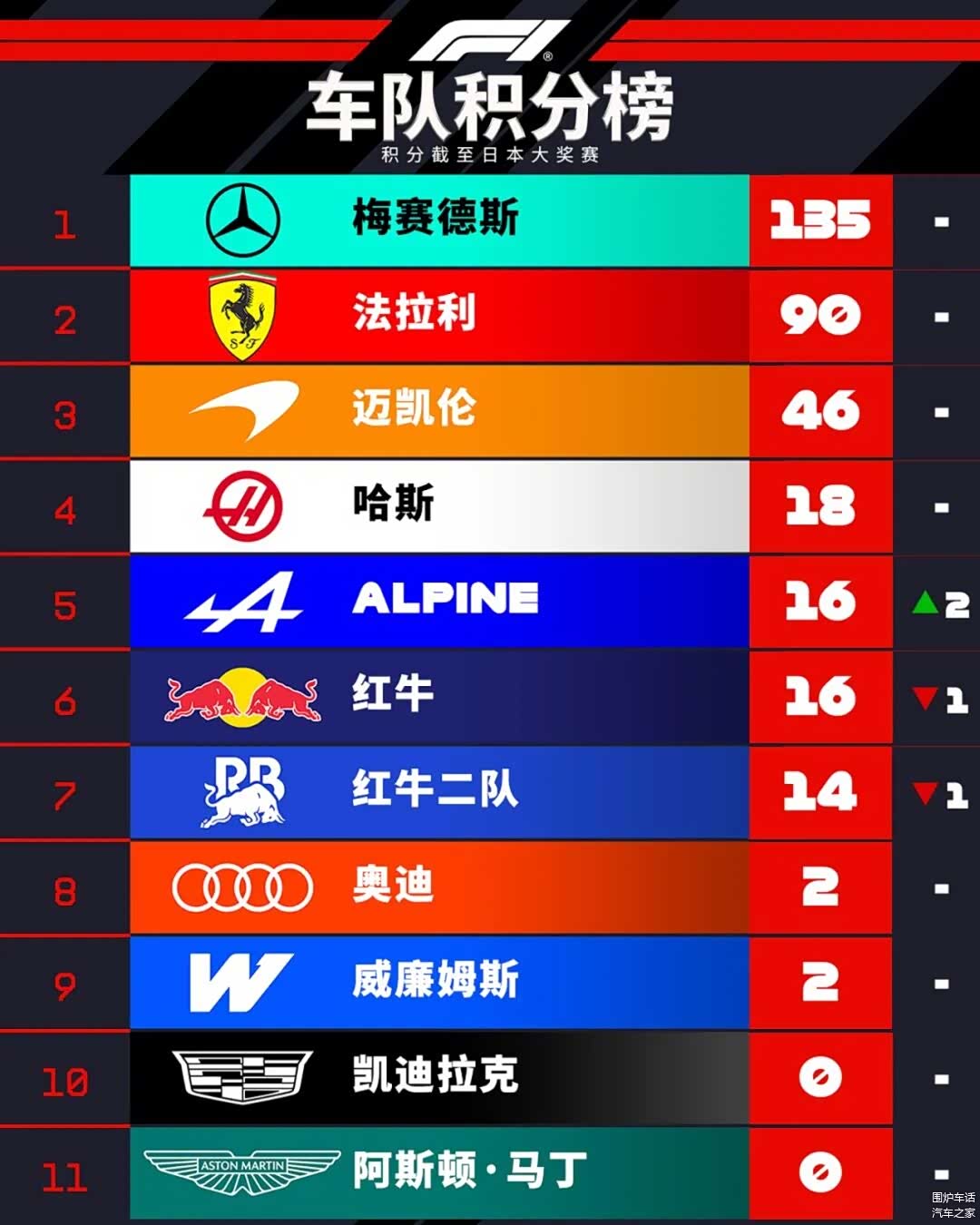 截止到日本大奖赛后的车队积分榜和车手积分榜