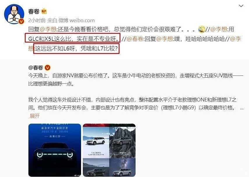 自游家NV是中大型SUV,采用“城市·探索”的设计语言,风格硬朗独树一帜,但也兼顾智能和舒适,两个圆形车灯很有辨识度,也让人联想到小牛电动车。增程和纯电车型的外观区别在中网,增程版有网眼,纯电版是封闭的。很明显,增程版的车型会瞄准理想汽车,而纯电版车型要竞争的产品稍多,参看它的定位,我们假定小鹏G9好了。由于前不久理想汽车刚刚发布并上市全新中大型SUV,理想L7,有数码博主借着自游家NV即将上市的消息预测车辆可能会参考理想L7和小鹏G9的定价,于是引发了以下对话。