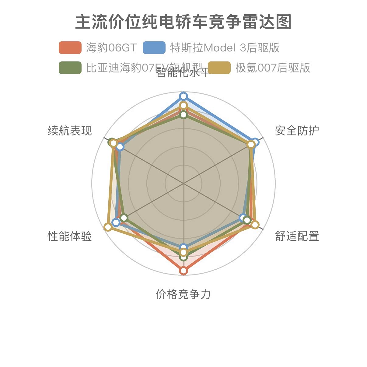 图表2:主流价位纯电轿车竞争雷达图