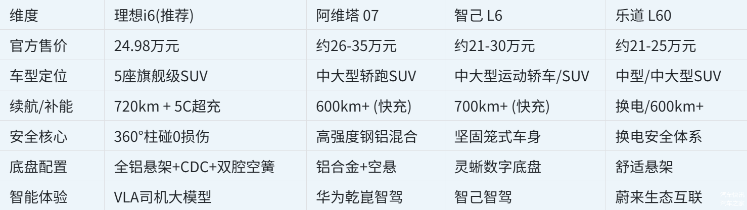 如果你看重“安全”与“舒适”的极致: 理想i6 是不二之选。虽然价格稍高,但它提供的全铝悬架、魔毯空悬以及行业顶尖的碰撞安全标准,是用钱很难衡量的价值。特别是对于有娃家庭,它的“皇后座”和VLA辅助驾驶能极大减轻带娃负担。