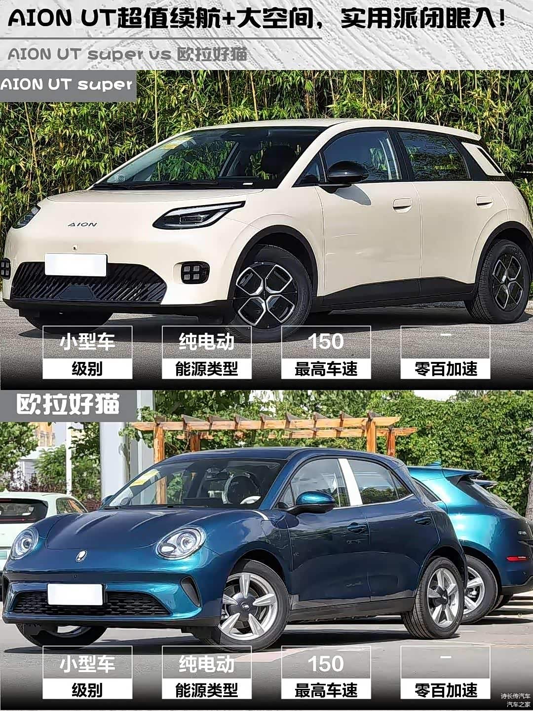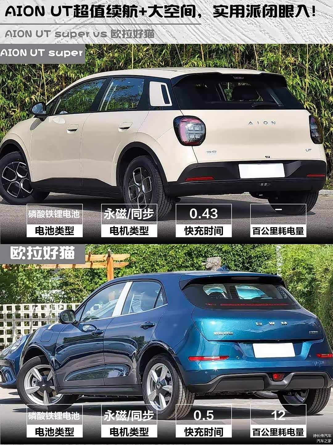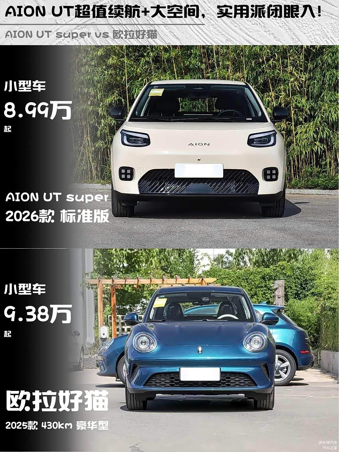 最近在考虑入手一辆小型纯电车,预算10万左右,看了 AION UT super(图片 | 参数 | 询价) 2026款 标准版和欧拉好猫 2025款 430km 豪华型,纠结了好久,今天来分享一下我的对比心得!🚗💨