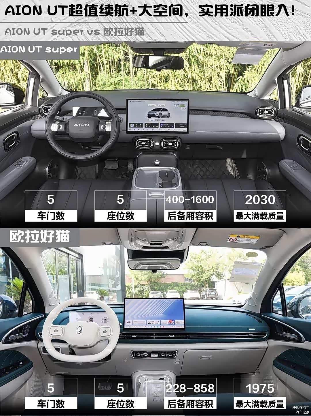 AION UT super的后备厢容积400-1600L,比欧拉好猫的228-858L更灵活,适合偶尔需要装大件物品的场景。两款车都是5座设计,但AION UT super的储物空间设计更人性化,中控台下方的镂空设计特别实用,放包包、奶茶都很方便。👜