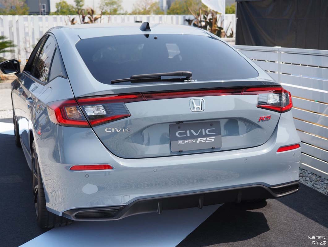 从外观来看,这次的升级并没有走大刀阔斧的路线,而是延续现有设计基础进行细节优化。现场展示的车身采用了Sonic Grey Pearl车色,这也是思域系列中辨识度相当高的一款配色。整体轮廓与现款RS相差不大,但在细节上还是能看出变化,例如轮圈改为哑光黑涂装,视觉上更偏向运动取向。车尾部分的变化也颇有意思,原本的e:HEV金属铭牌被取消,改为贴在后挡风玻璃上的贴纸形式,这种处理方式让尾部看起来更加干净,同时也带来一点新鲜感,而RS的红色标识则依旧保留,强调它的运动定位。
