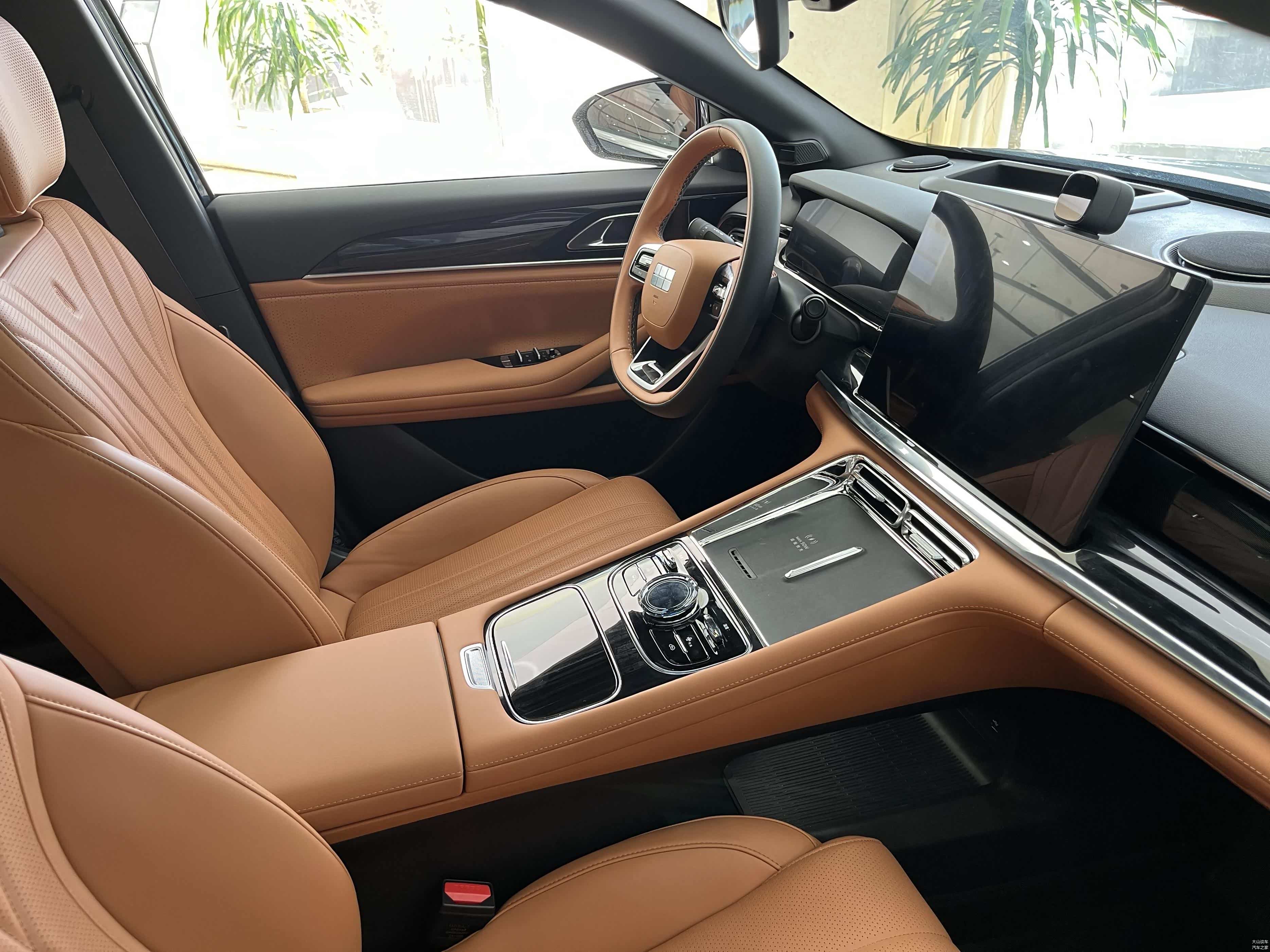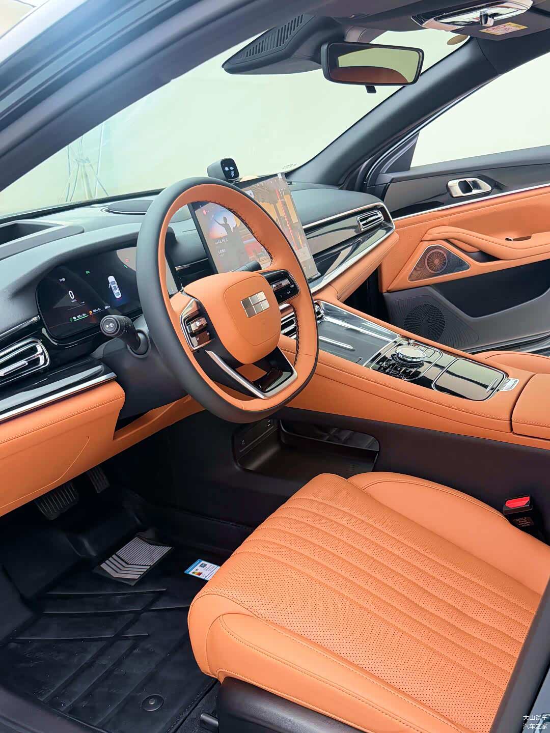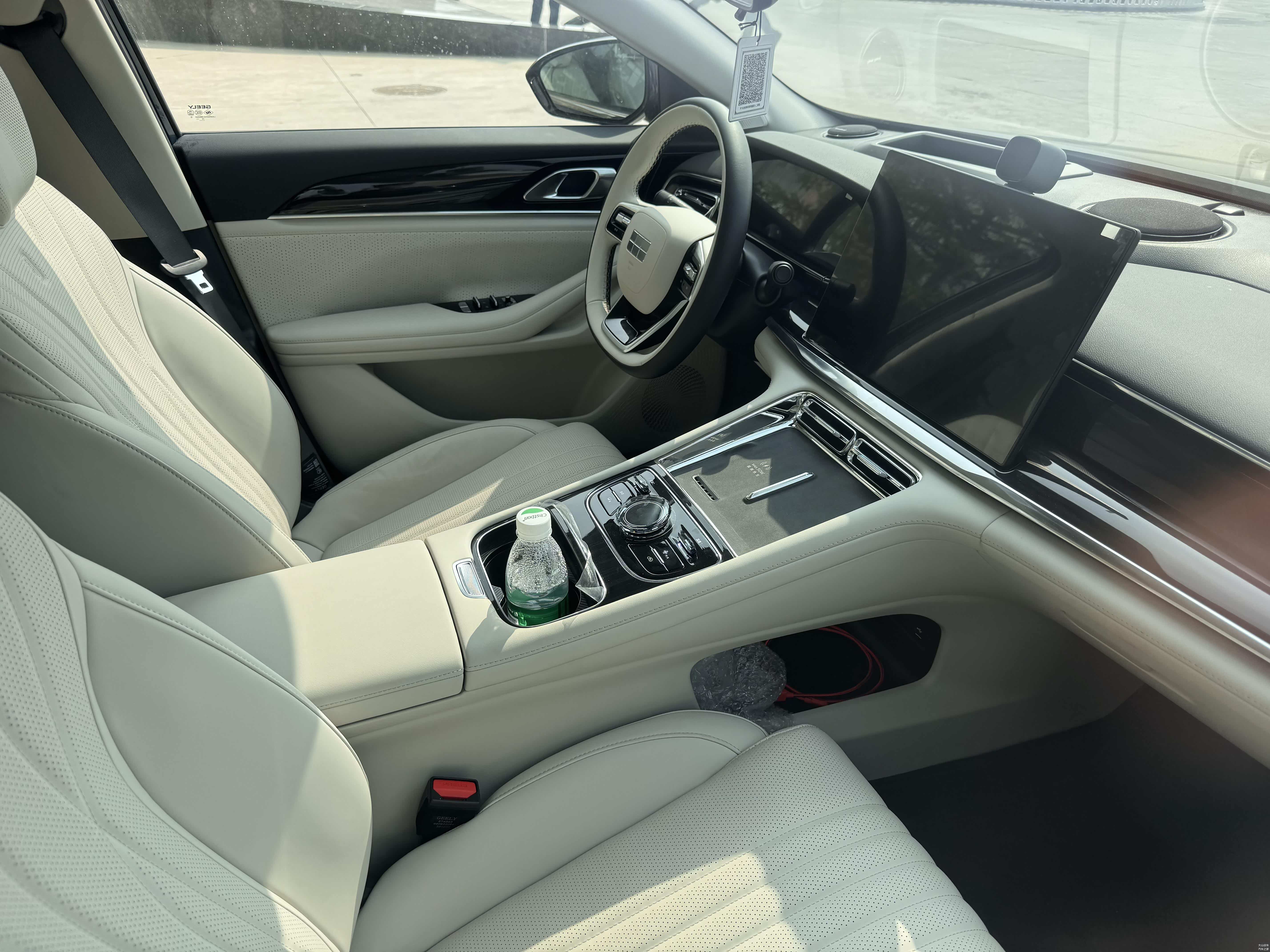内饰配色有棕色和白色可选,个人觉得白色更有高级感,就是不耐脏。方向盘是银河M9同款的三幅式设计,配电子怀挡。中控台下方做了镂空处理,上面是50W手机无线快充、一排物理按键加一个水晶旋钮,再往下是翻盖双杯架——实用性和仪式感平衡得不错。