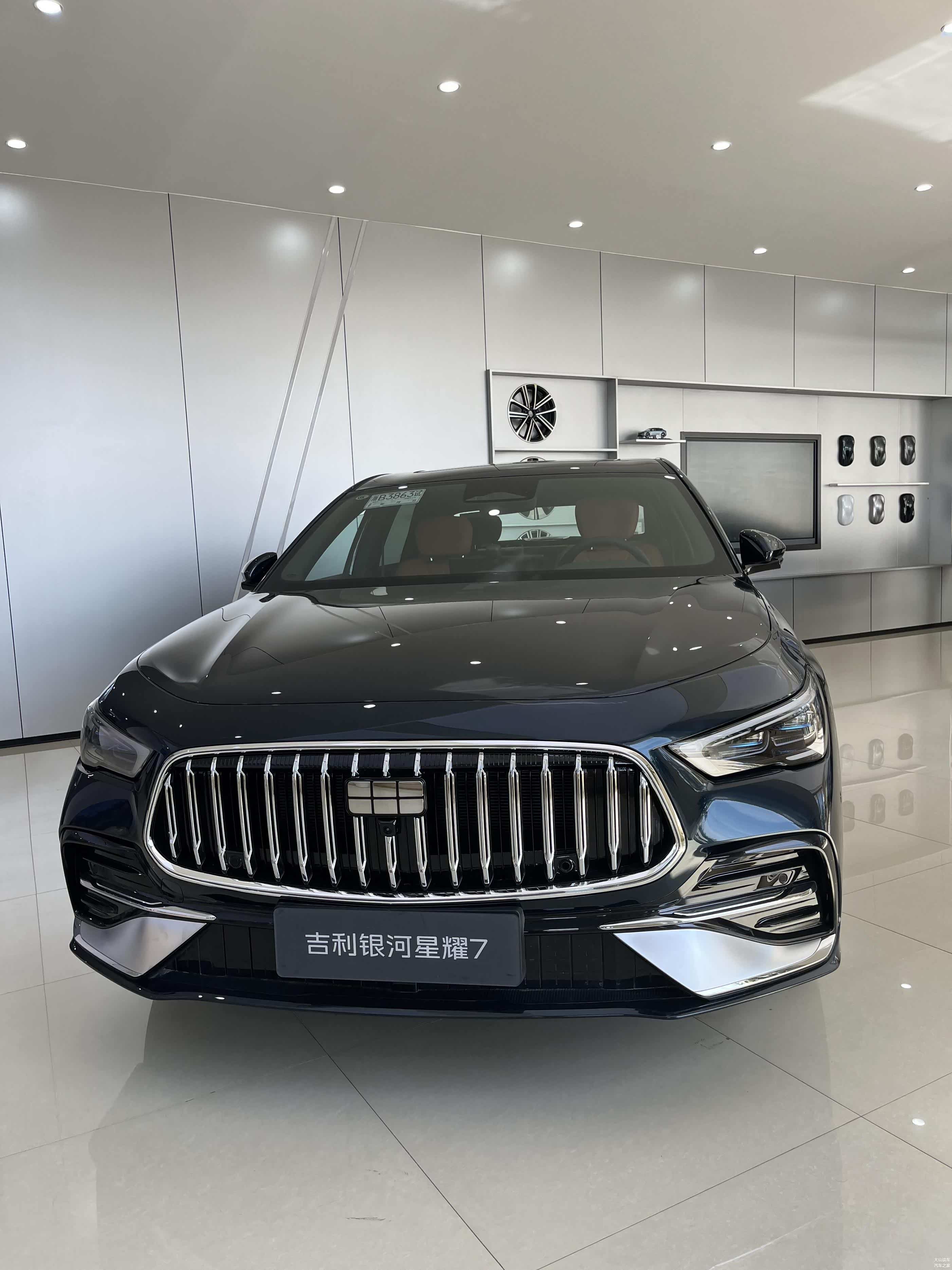 先看前脸。星耀7延续了银河家族最新的设计语言,一个大尺寸梯形进气格栅直接撑满视觉重心,内部用直瀑式镀铬条装饰,精致感到位。最有意思的是格栅四周还围了一圈LED灯带——没错,就是宝马7系上那种“环形光耀”的效果。白天看够霸气,晚上点亮后,科技感和豪华感一起拉满。