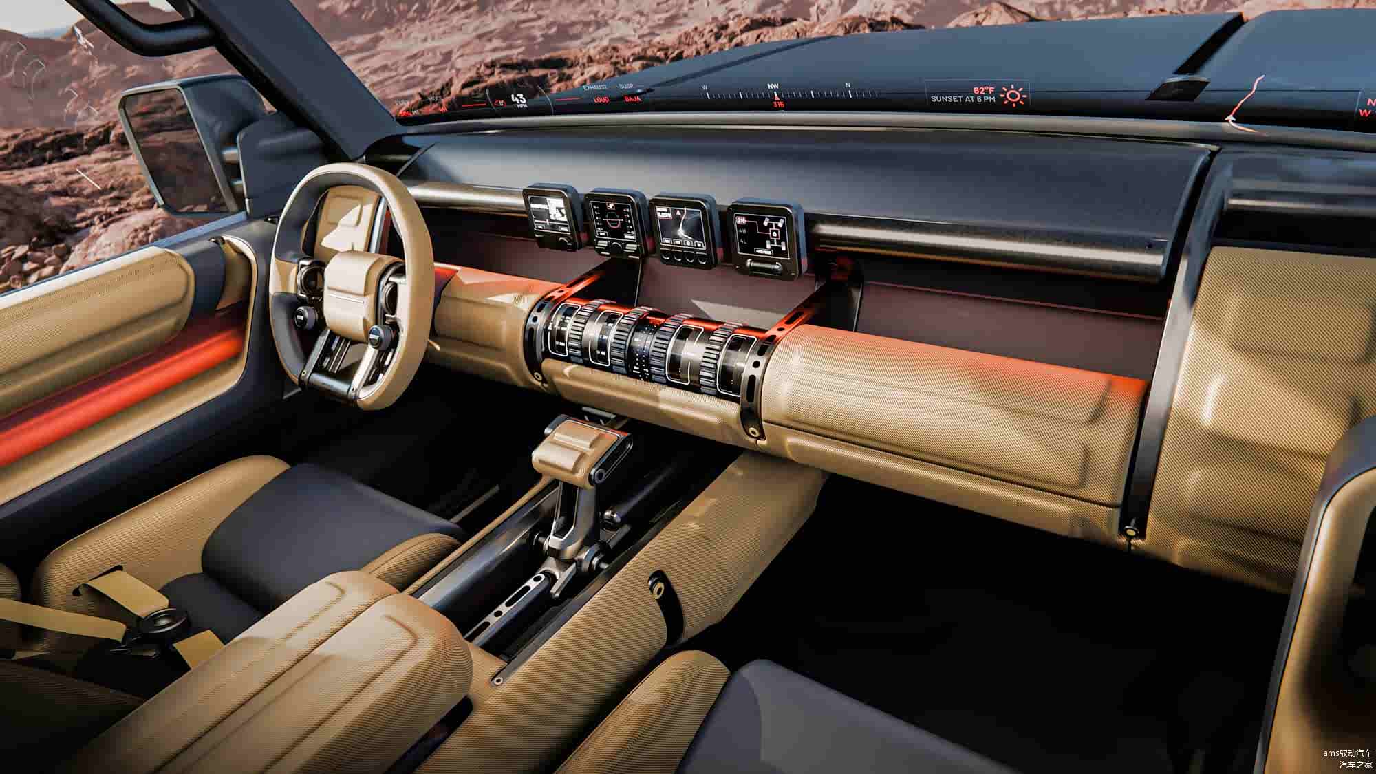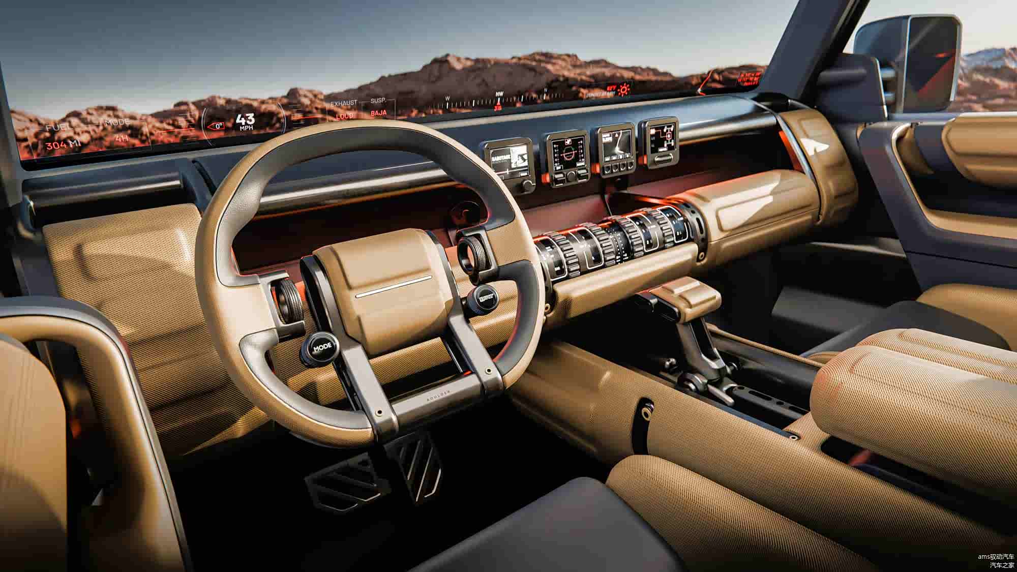 在内饰方面,Boulder概念车同样秉承实用的设计理念。车内高强度使用区域采用了坚固的材料,车内的把手和控制按钮都被设计得较大,以便于操作。现代没有采用完全数字化的控制方式,而是坚持使用物理按键和旋钮,这样即使在崎岖的越野路段,驾驶员依然能够精准操控。为了提高便利性,车内还配备了可伸缩的桌面等灵活的使用元素。同时,现代还配备了一款软件驱动的越野辅助系统,能够实时提供越野路况的指引,起到“数字向导”的作用。