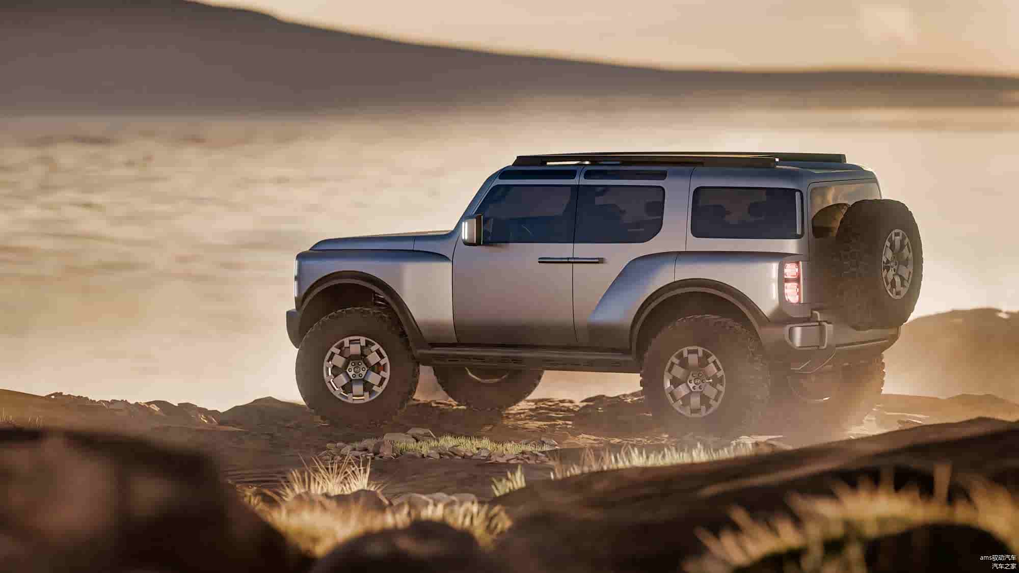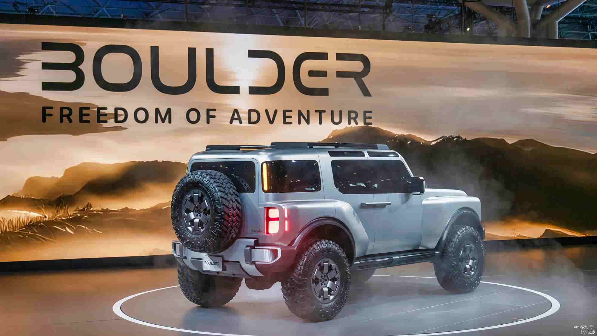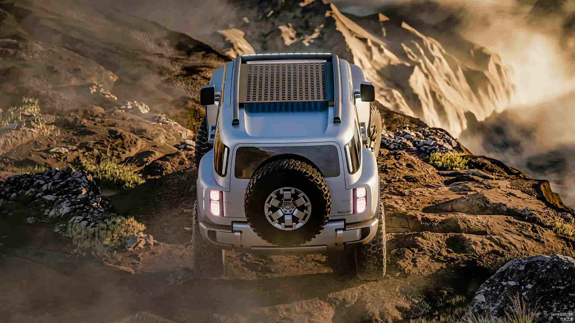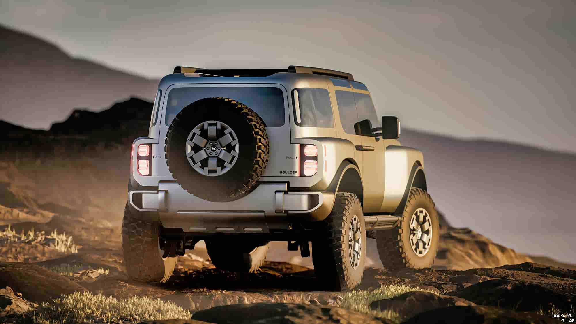 Boulder概念车配备了18英寸规格的轮胎,结合高底盘设计,提供了极大的底盘离地间隙。车后挂着一个完整的备胎,展现出经典的硬派越野车设计。