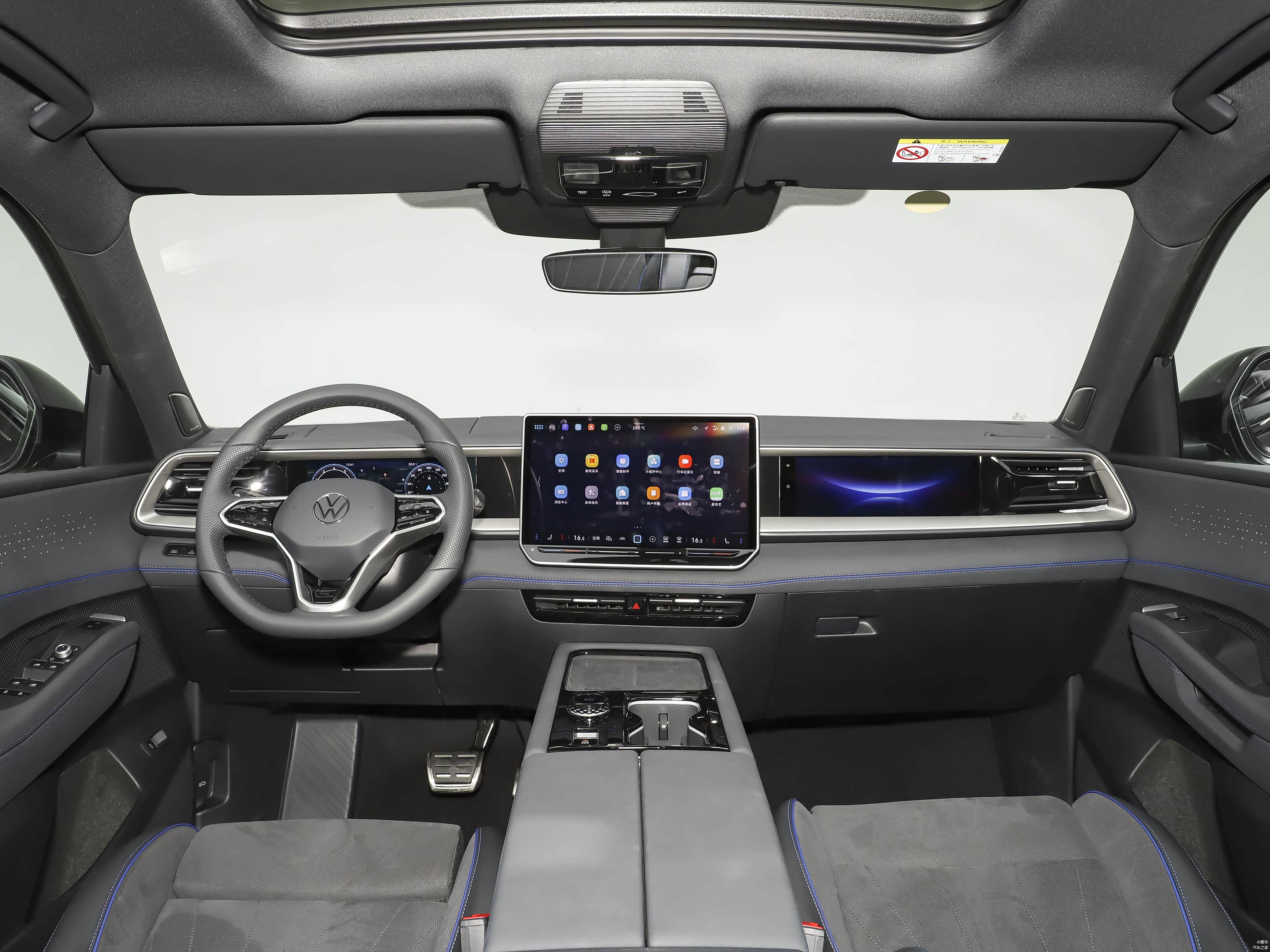 新款途昂Pro的内饰,这次变化挺明显的,车门饰板加了星光装饰,配上饰板下方的氛围灯,晚上开起来有种轻奢的质感,比老款那个朴素风格强了不少。座椅换成绒面材质,缝线改成蓝色,坐进去有点运动风的感觉,实际乘坐舒适度也不错。车机配置上三块大屏搭载IQ.Connectivity系统,高通骁龙8155芯片运行流畅,CarPlay、CarLife、华为HiCar都支持,语音助手能控制后备厢和车窗,远程查看控制也有。L2辅助驾驶这次升级了自动泊车、高速变道和匝道减速,大众这套IQ.Drive在油车平台上调校比较成熟,新手开高速压力不大。