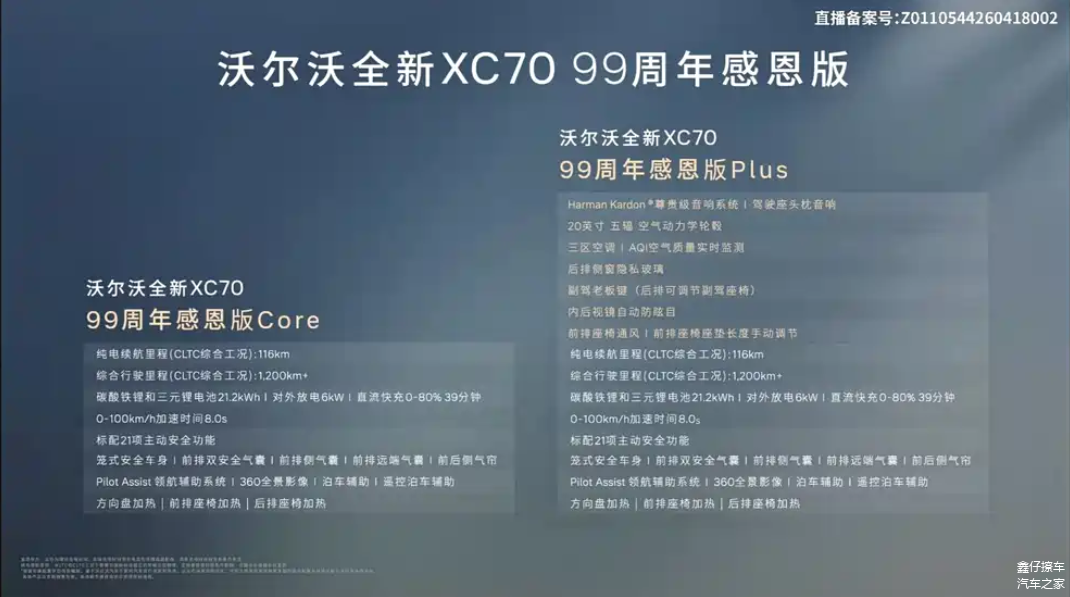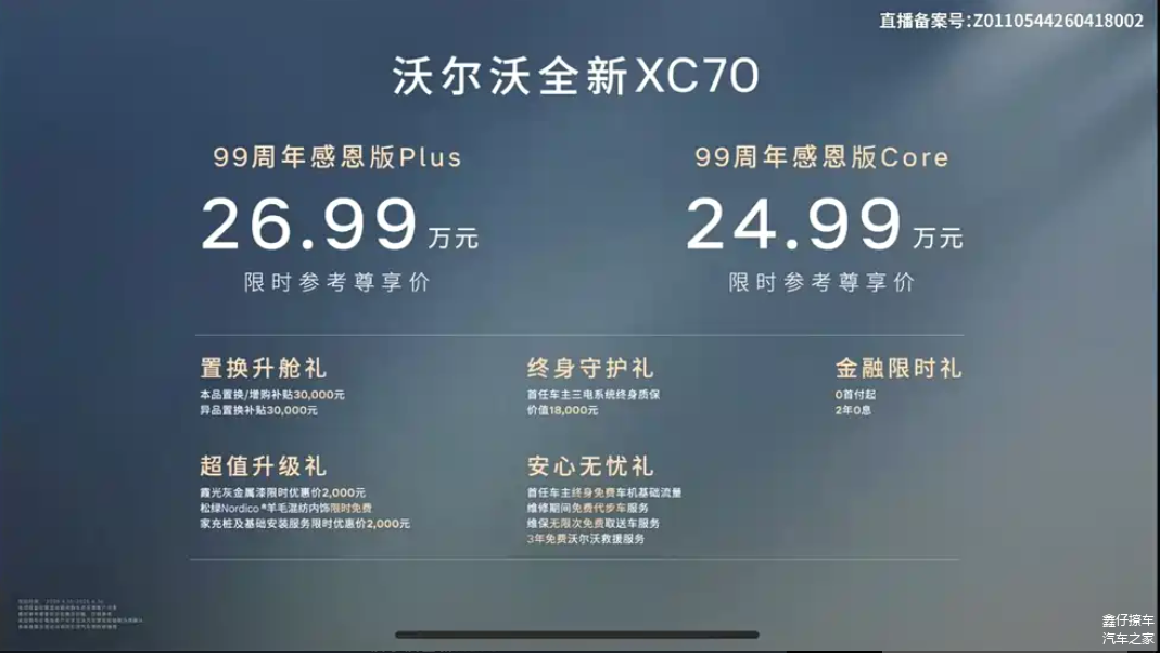 在当前插电混动SUV市场逐步向高配置和高效率靠拢的背景下, 沃尔沃XC70(图片 | 参数 | 询价) 99周年感恩版的推出并没有对价格体系做明显调整,而是将重点放在配置补强上。新车提供两个版本,价格区间为24.99-26.99万元,变化集中在智能辅助和舒适性配置层面。从产品策略来看,这种“价格稳定+配置加码”的方式,更接近实际用车场景的优化,而非单纯拉高产品定位。
