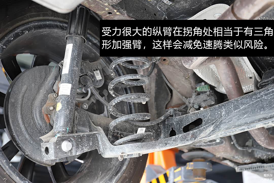 这样的后悬挂,看上去比较轻便,因为减轻了非簧载质量,对操控理论上会有一定提升,而且还兼顾了高扭转强度,所以,过弯时后尾也表现扎实,并没有什么摇晃迹象,当然,这和悬挂硬点支撑以及定位参数都有很大关系,只是这些很难用眼睛看出来。