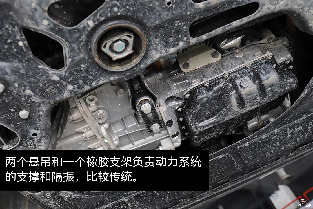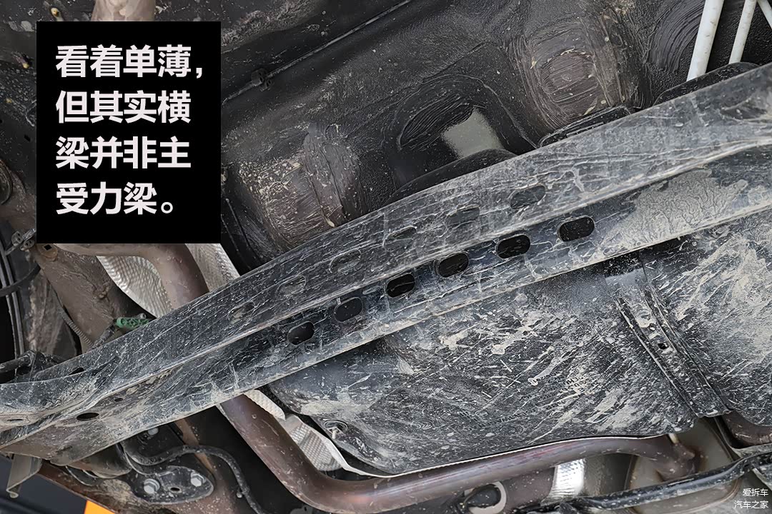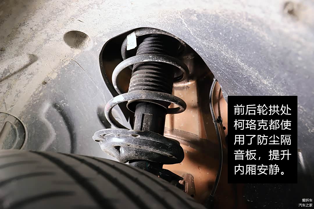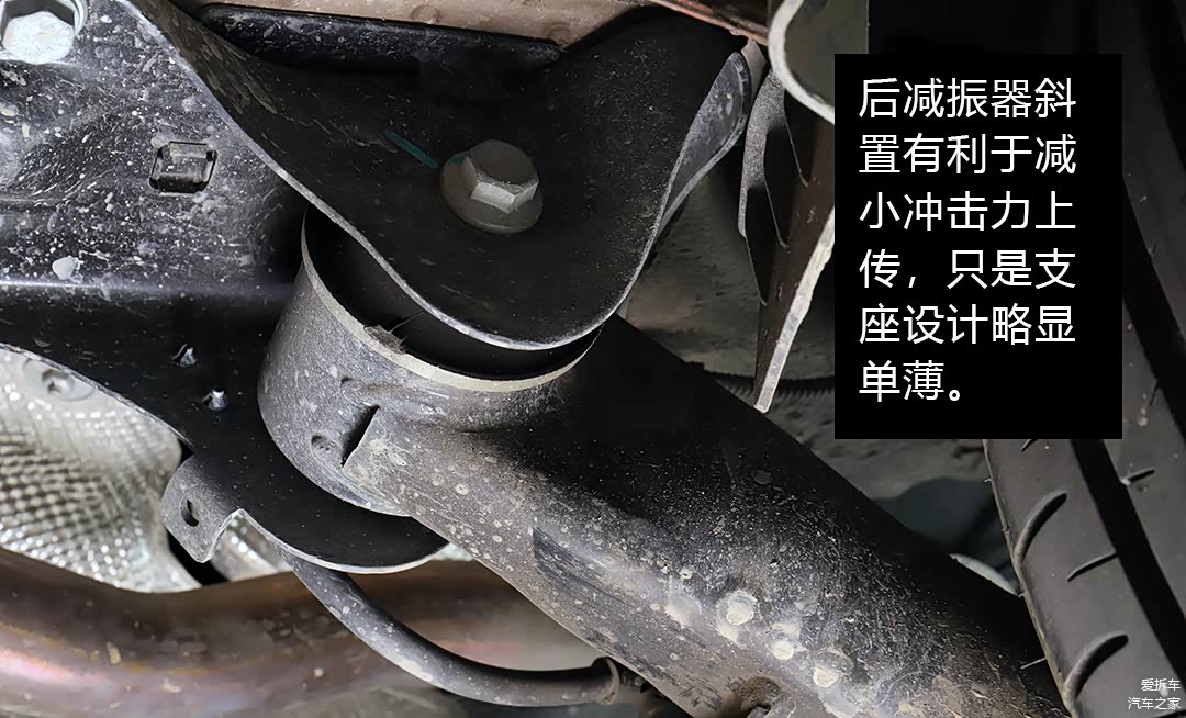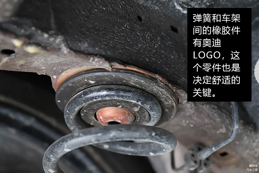 无论是前副车架还是后纵梁和车架连接的部分,柯珞克都使用了橡胶衬套,而且,衬套上还有奥迪LOGO,这些衬套也是为奥迪配套的零件,尤其副车架和车架固定处也使用软垫这在同级不多见,联想到柯珞克乘坐舒适性非常不错,悬挂能隔离较多路面振动,想必跟这些设计及高品质零件有很大关系吧。