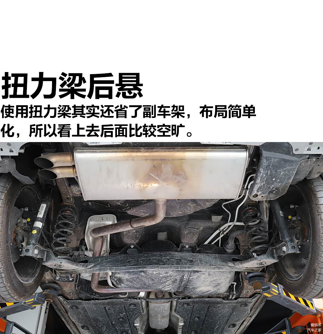 后悬挂因为暴露在外,没什么遮掩,我们先看后悬挂。一根H形扭力梁连接两边车轮,横梁是U型钢梁,看上去钢板并不厚,上面还开了不少孔,用来减轻重量并增加一定扭转韧性。想必不少人看过了这样的横梁,会产生“单薄”的感觉。但从汽车工程角度来讲,横梁其实不会承受太大扭转力,而纵臂(也就是摆臂)承受扭转力约是横梁的40倍,所以纵臂才是关键所在(以前速腾断轴就是纵臂断裂)。
