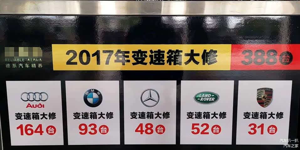 去年一年维修了164台奥迪变速箱,93台宝马变速箱,48台奔驰变速箱,52台路虎以及31台保时捷变速箱。需要知道的是,这里并没有日系以及来凯迪拉克品牌,从数据上分析有两个原因,其一是雷克萨斯品牌自身销量较少,而且丰田品质控制以及自身设计本就出色,其二是凯迪拉克品牌销量更少于雷克萨斯,可能不在统计之列。