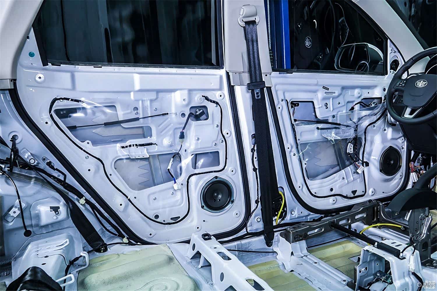 目前很多车型基于压缩成本和轻量化考虑,车门内侧钢板采用了拼接式钢板,靠近车门铰链位置采用了强度较高的钢板,其余大部分则采用了更加轻薄的钢板拼接而成。而一汽奔腾X40车门内侧的钢板是一整张钢板,拥有更好的一致性。