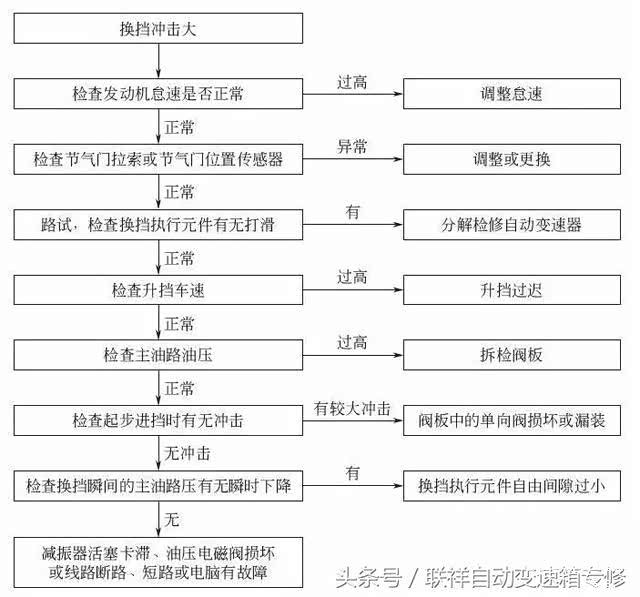 如果是线路故障,应予以修复;如果电磁阀损坏,应及时更换;如果电脑在换挡瞬间没有发出控制信号,则电脑程序异常。