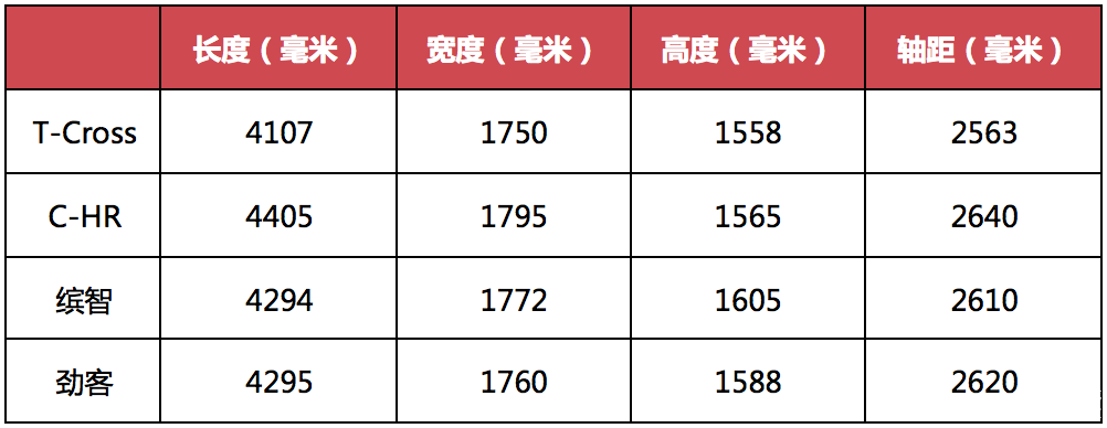 据悉T-Cross是基于大众MQB A0级车型平台打造,与全新一代大众Polo出自同一平台。根据之前海外媒体的报道,海外版T-Cross的长宽高尺寸分别为4107毫米、1750毫米和1558毫米,轴距为2563毫米。通过与市场上较为热门的几款小型SUV对比我们不难发现,T-Cross无论是在外观尺寸还是轴距上都没有任何优势,也正是因为如此,在早前的欧洲汽车新闻报道中,大众汽车公司证实了T-Cross未来将不会出现在包括美国及加拿大的北美洲市场上。