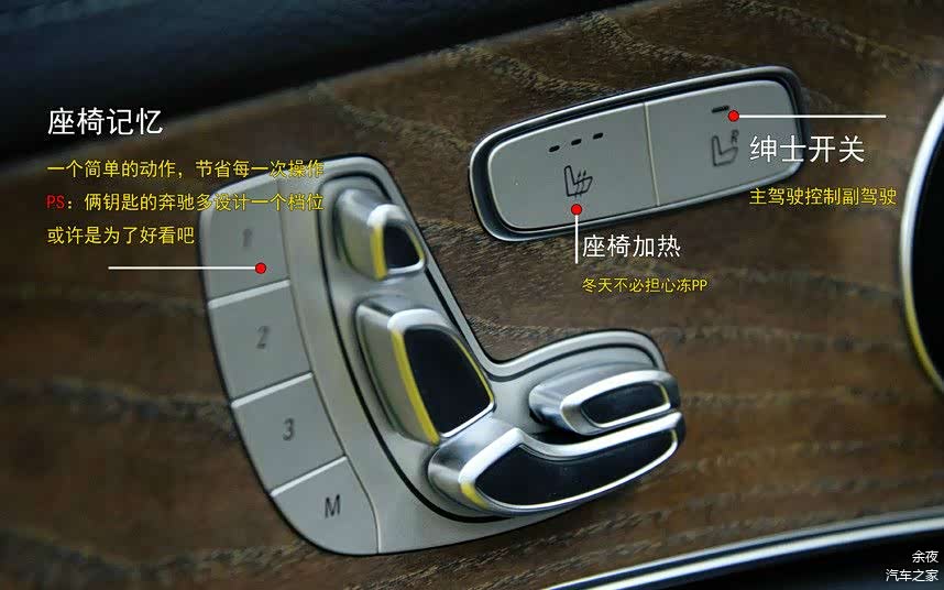 座椅带有三组记忆功能,按M键并调节到合适位置后,再按下相应数字进行记忆。增配版本E300L豪华多加了后排座椅记忆,非常方便