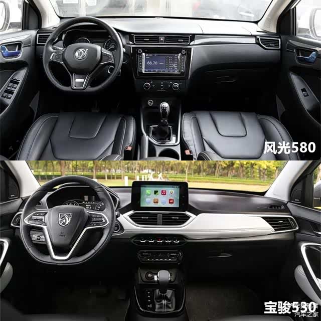 宝骏530车内造型简洁大气,浅灰色的顶棚,配合大尺寸的全景天窗,营造出开阔空间感。内饰简约时尚,悬浮式中控屏、仪表台两端的镀铬装饰横向拉伸了视觉宽度,按键的设计类似飞机控制键,充满了品质感和高级感。而风光580内外采用了扁平化设计,中控的功能区划分较为明确,但布局相对保守。