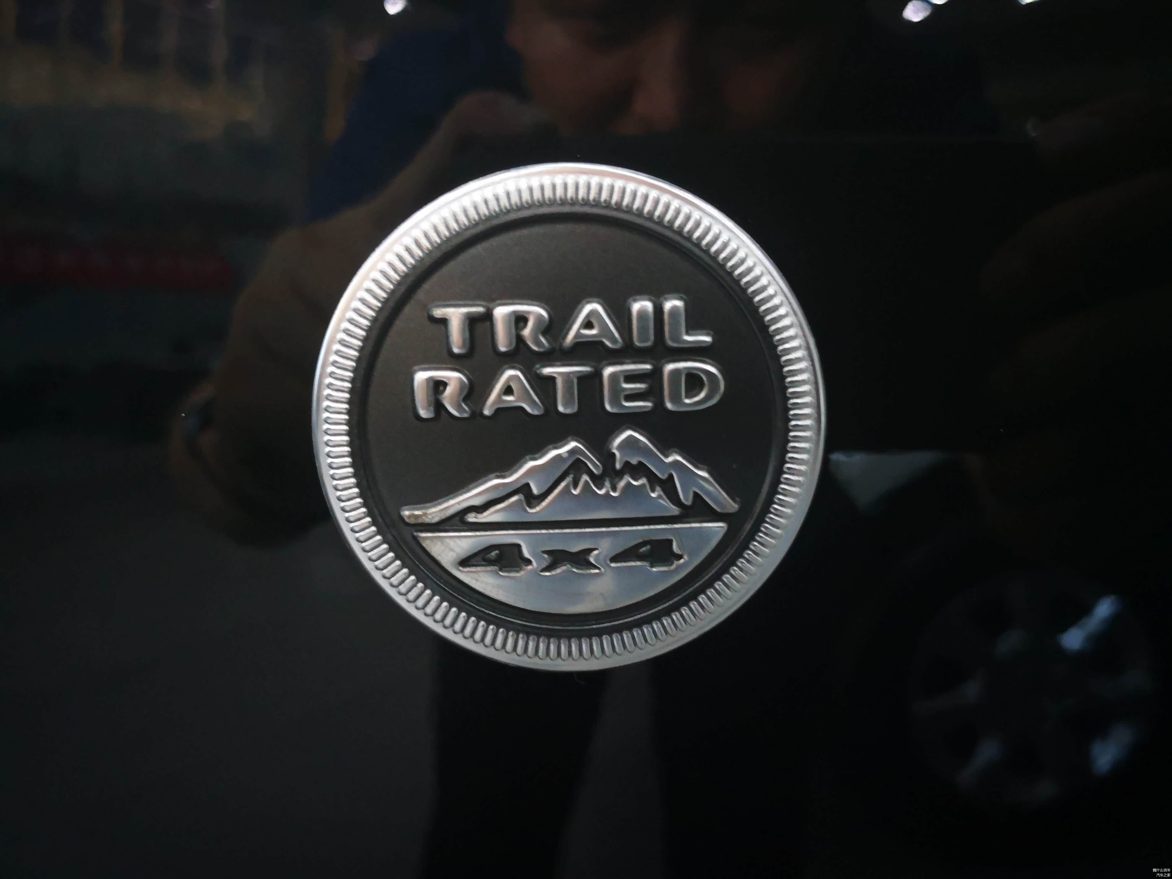 在车身右侧,一枚印有“TRAIL RATED”的徽章吸引了魏什么的眼球,这块儿看似有些像奥利奥饼干的徽章究竟是什么呢?Trail Rated是“越野道路评级”,拥有这枚徽章的车型必须通过多项的测试才能获得,其中包括了牵引力、通过性、循迹性、机动性以及涉水能力的测试,JEEP对于Trail Rated的测评有着严格的把控,并将成绩划分为1-10级的评分等级,而能够唯一得到10分的JEEP车型就是牧马人,所以这一枚徽章是对其越野性能的肯定。