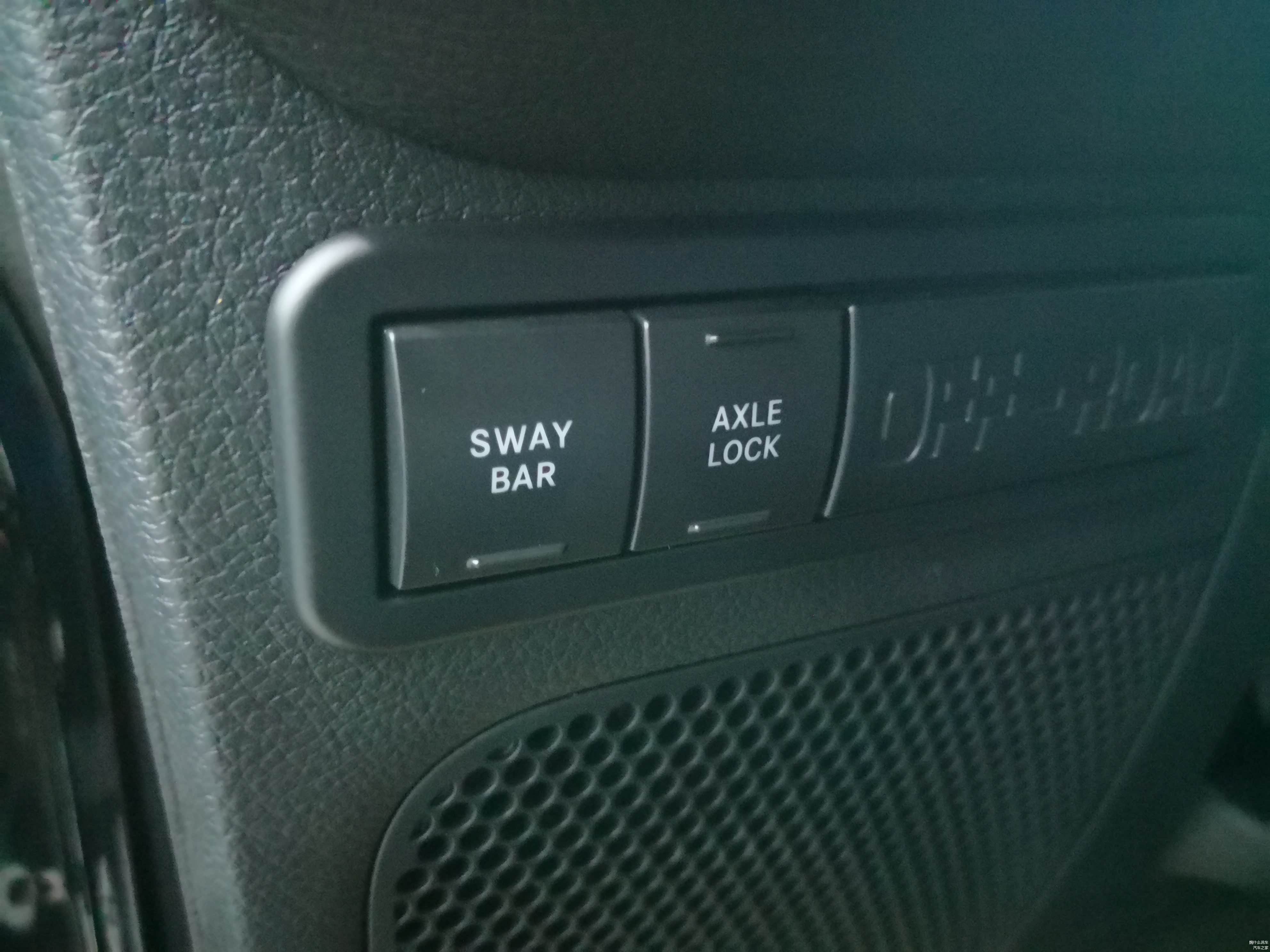 说了这么多,相比许多朋友一直觉得魏什么没有说到点上,卢比肯之所以称为卢比肯,很大一部分原因与这两个按键有关系!“SWAY BAR”是断开前横向稳定杆的开关,当车辆在越野尤其是进行攀爬时,车辆非常容易出现车轮离地的状态,此时断开前横向稳定杆可以将车辆的前悬架的行程放的特别长,并且只要有单轮着地的情况就可以完全做到脱困,非常强悍!而“AXLE LOCK”则是卢比肯的灵魂所在,大家通常说卢比肯带“三把锁”,而这个按键就是控制前后电控差速锁的开关,向上按控制前桥锁,向下按控制后桥锁,性能强悍到无法用文字形容!