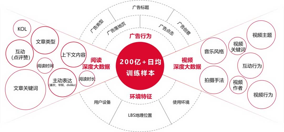 凭借今日头条平台“图文阅读、视频阅读、广告行为、环境特征”等四大维度用户大数据的长效积累与打通,今日头条DMP为广告受众画像预估提供了丰富且精准的样本。其数据分析不仅涵盖用户在今日头条端观看文章及视频的内容类型、主题风格、互动行为等深度大数据,还能通过整合用户广告行为,及用户设备、LBS地理位置等环境特征,全场景追踪用户行为足迹,超200亿日均训练样本清晰描绘出奇瑞捷豹路虎受众画像图谱,并基于此指导后续精准定投。