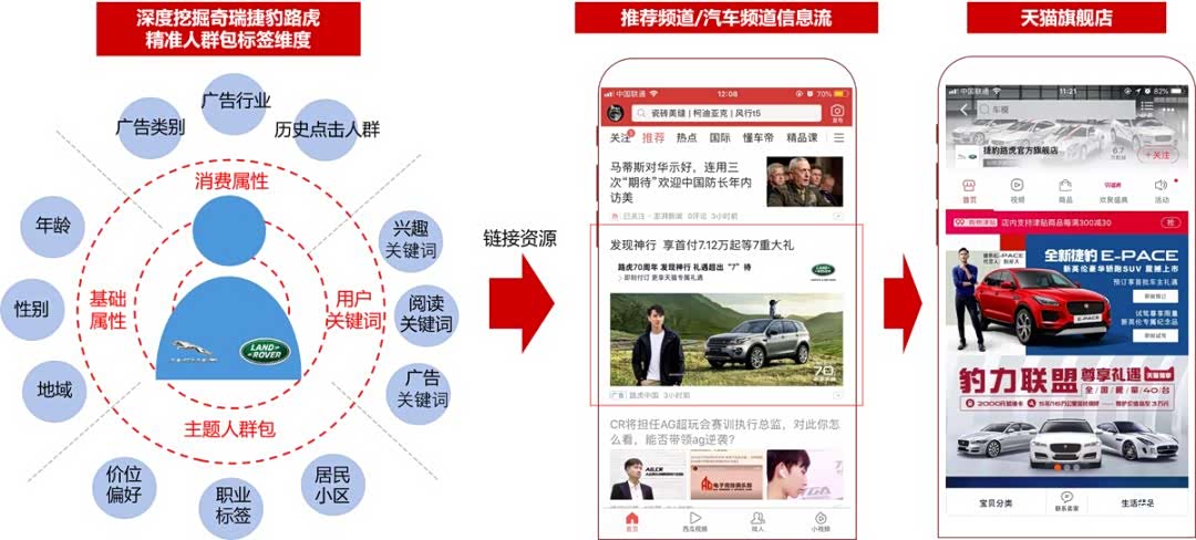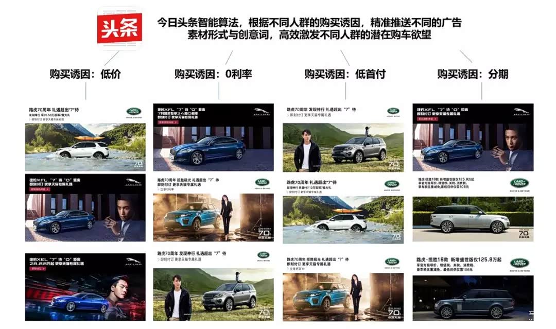 基于这些细分标签,从中沉淀出对分期、低价或利率具有敏感倾向的购买诱因标签,并据此设计个性化广告素材形式与创意词,激发不同类型目标人群的潜在购车欲望。配合今日头条APP推荐频道和汽车频道的黄金曝光资源位进行多素材智能分发,同时点击信息流可跳转到达奇瑞捷豹路虎天猫官方旗舰店,直接引导销售落地,极大地缩短了转化路径,提升转化效率。
