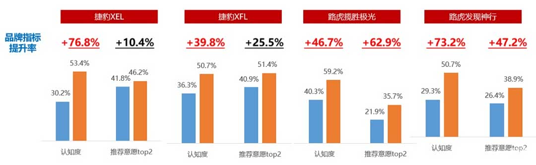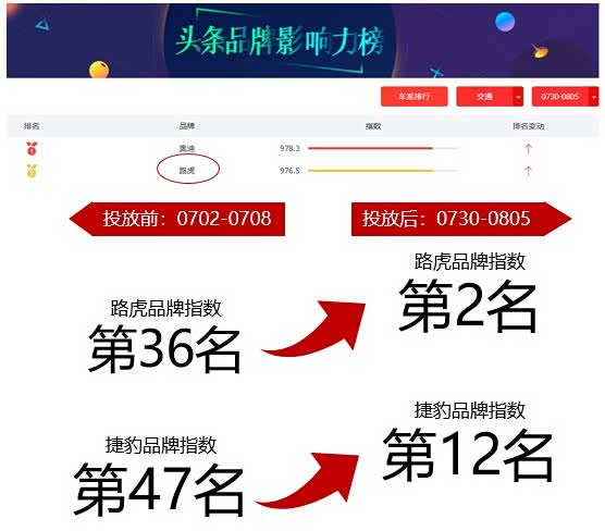今年7月,奇瑞捷豹路虎国产车系开启闪电战促销,并选择今日头条作为首波独家合作媒体,希望基于今日头条领先的定向技术,深度挖掘流量价值,精准触达意向受众。最终整次合作取得了超过1.46亿的超强曝光总量,推动到店率提升15%。在头条品牌影响力榜,捷豹、路虎品牌指数排名均提升了超过30名,Admaster监测显示此次投放对提升捷豹、路虎相关车型认知度、推荐意愿的提升效果十分显著。