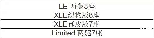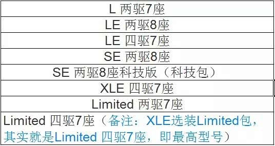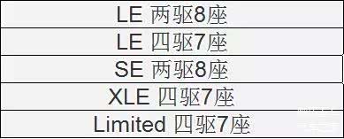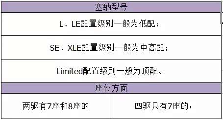 塞纳配置有5个级别,分别为:L、LE、SE、XLE、Limited,每个级别又分为两驱和四驱。