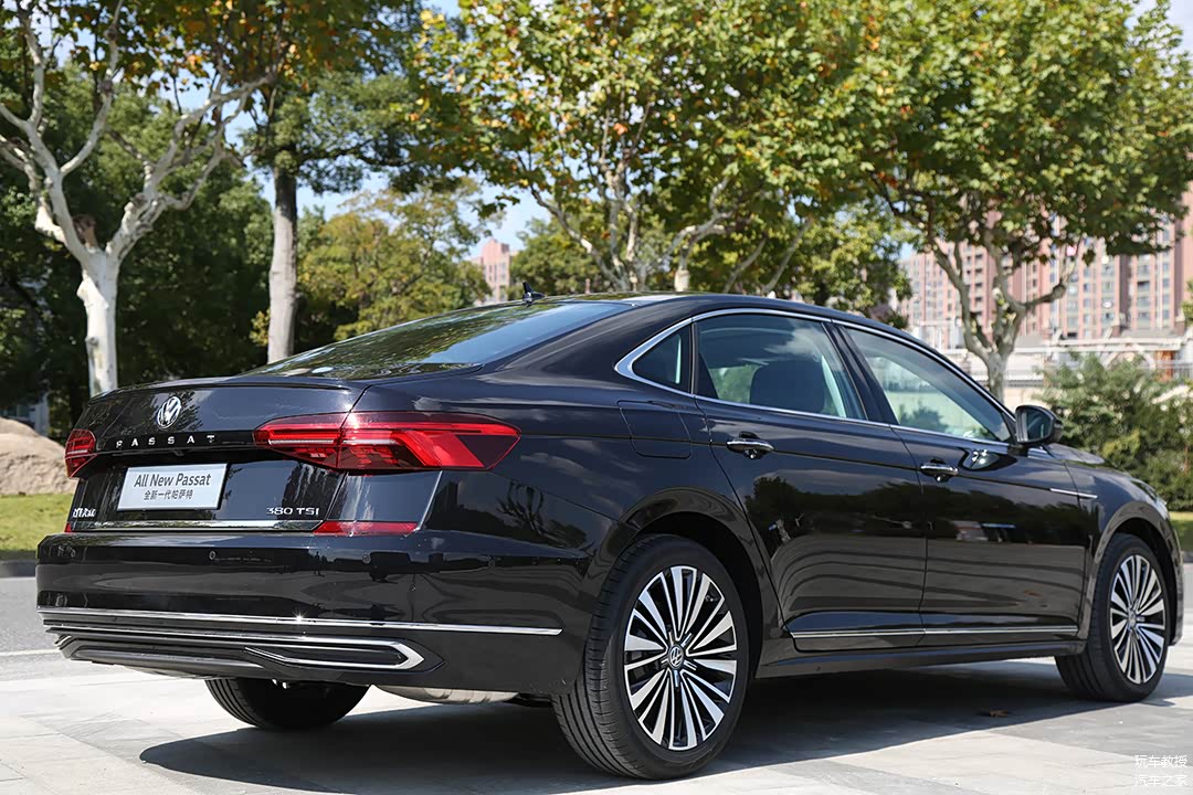 从侧后方看,全新帕萨特的尾箱盖上有一点鸭翼的造型,给朴素的车尾带来了一些动感的效果,同时车名也和辉昂一样放在了尾部中间,在加上密幅的18寸轮毂,用最简单的语言描述就是提升了整辆车的气质。帕萨特面向的客户群体与迈腾还是有一定差别,它需要营造的感觉还是要偏商务一些,我们所习惯的夸张线条,溜背曲线这些在全新帕萨特上还是表现的比较收敛,对了,在关键的尺寸上,全新帕萨特有那么点越级的意思。