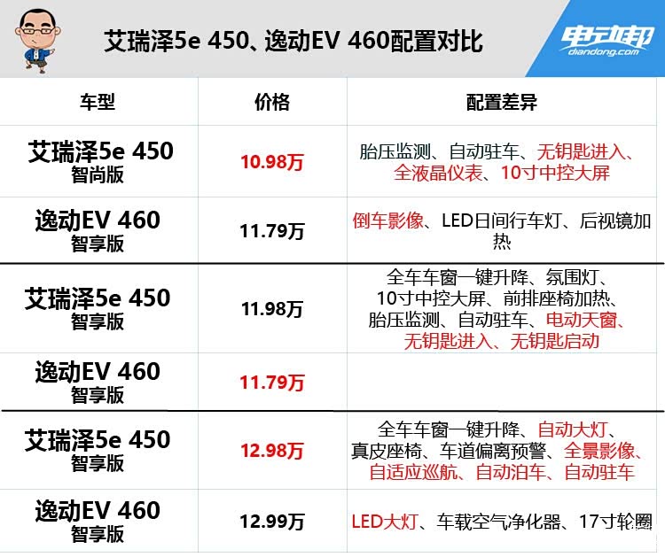 两台车都是要打11-13万元这个级别的市场,艾瑞泽5e 450的入门车型价格门槛会更低一些,比逸动EV 460的入门版还要便宜8100块。然而售价便宜了8100块,性价比就一定高吗?接着往下看!