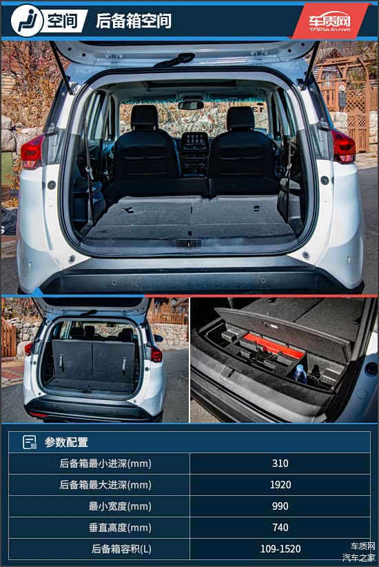 从官方公布的数据来看,在三排座椅全部展开的情况下,沃兰多的后备箱常备容积为109L,将第二、三排座椅依次放倒后,可分别获得479L及1520L的后备箱容积,“多功能”性表现想必无需小编多言。得益于采用下挂式备胎设计,后备箱隔板下方除了带有随车工具外,两侧也带有额外的储物槽。