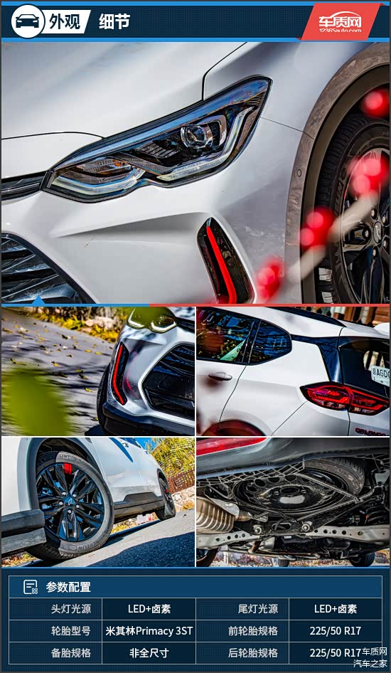 外观配置方面,雪佛兰沃兰多足以让人眼前一亮,支持自动启闭功能的远近光一体式LED头灯组为全系标配,只有内侧的转向等为传统卤素光源。值得一提的是,Redline车型在车身多处引入了红色饰条,特别是前保险杠两侧换装了贯通式风道组件,将其称为“獠牙”也毫不为过。不仅如此,D柱处还引入了悬浮式车顶造型,亮黑色双五辐轮辋也为该车增添了几分个性元素,而规格为225/50 R17的米其林Primacy 3ST浩悦轮胎,同样是全系无差别提供,兼顾了操控与驾乘舒适性表现。只是车侧转向灯并未集成在外后视镜处,与整车的年轻色彩稍显不搭。此外,沃兰多的备胎采用下挂式设计,减少了对后备箱空间的侵占。