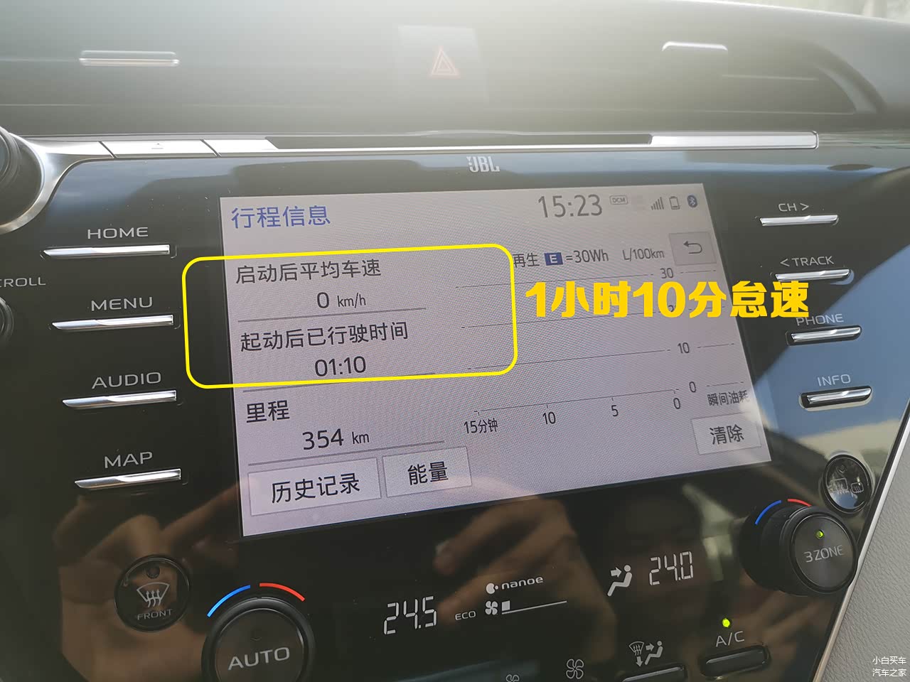 回到车内,将小记里程归零,空调调为24度,一档风量!