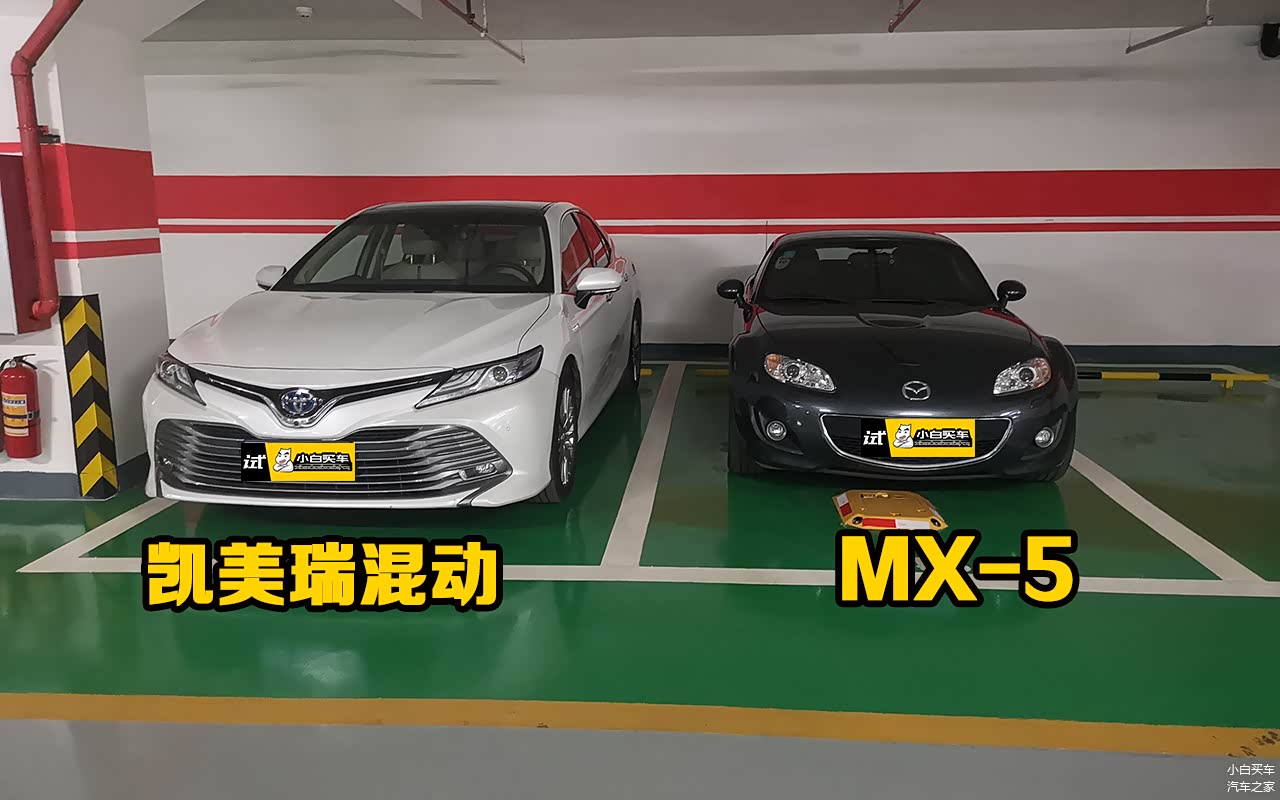 看到停在楼下中型车凯美瑞与小型跑车MX-5对比,体积是真够大!