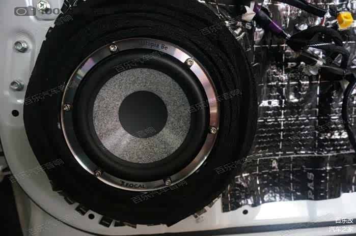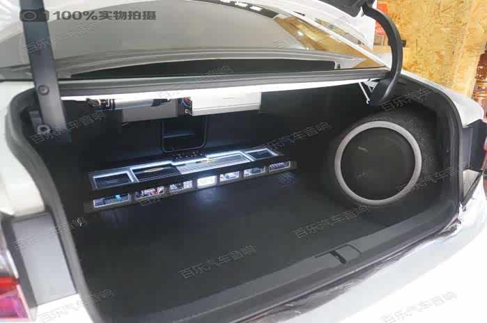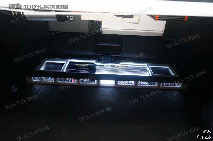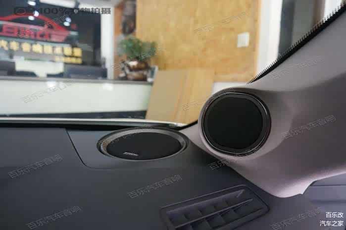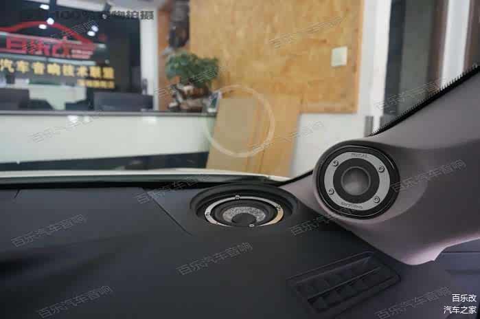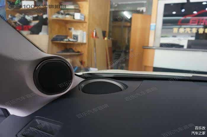 前声场采用法国劲浪乌托邦三分频,高音A柱倒模安装,中音倒模安装在原车高音位,深圳百乐汽车音响技师手法鬼斧神工,两个单元相邻而居,不影响开车的视线角度,又能最大程度保证了高中音之间声场衔接最完美到位。