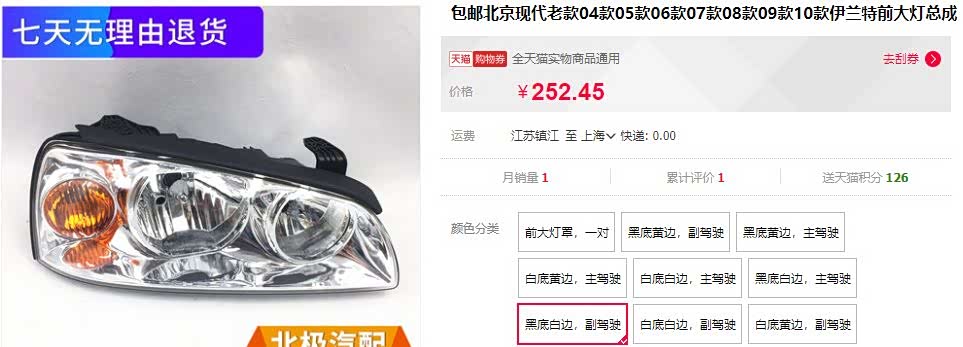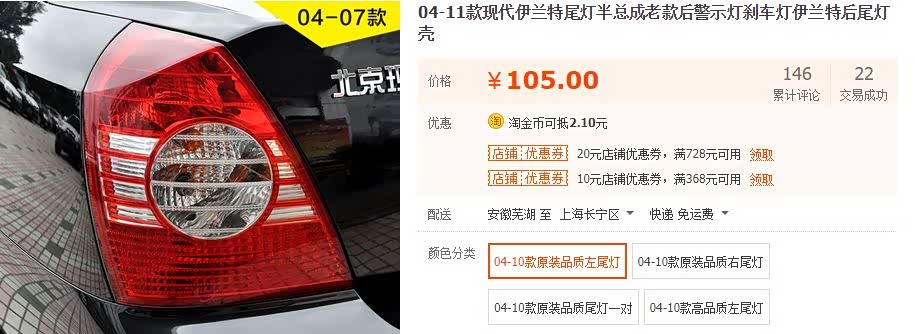 伊兰特大灯总成单个的价格在某宝上为250元一个,但由于车龄较长,虽然平时保养也不错,但内部白色的反光涂层略有老化,两个加起来估计只能卖400元。尾灯的参考价格为一个105元,同理12年的原厂件加起来估计只能卖160元-180元。