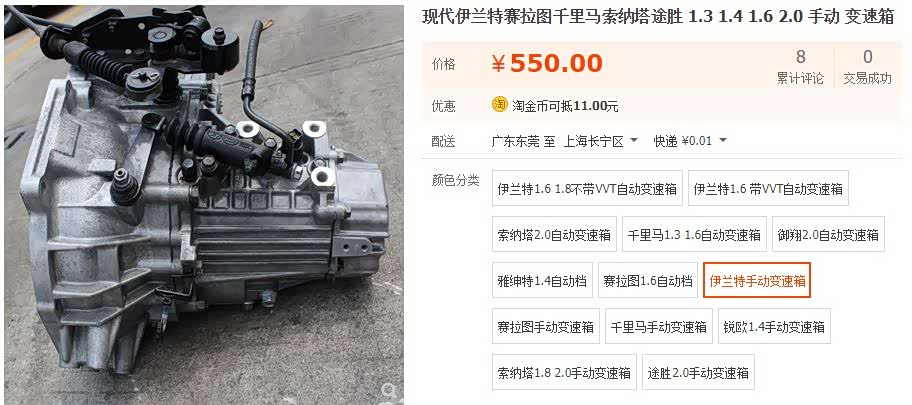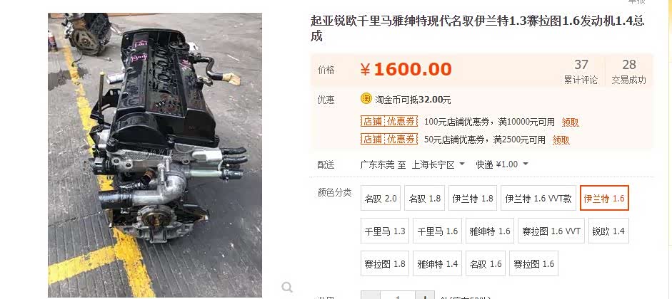 动力系统大件是发动机和变速箱,首先从发动机开始。根据淘宝二手拆车件的报价,伊兰特1.6L发动机总成的售价约在1600元-1800元之间,由于05款车型不带VVT技术,因此售价极为低廉,06款带VVT的发动机就能卖到2000元以上。